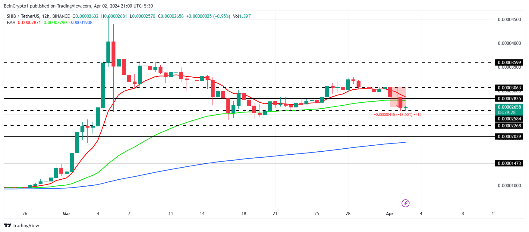 SHIB will likely trickle down to test the $0.00002268 support level. Given the aforementioned conditions, this decline could extend beyond this crucial support level.