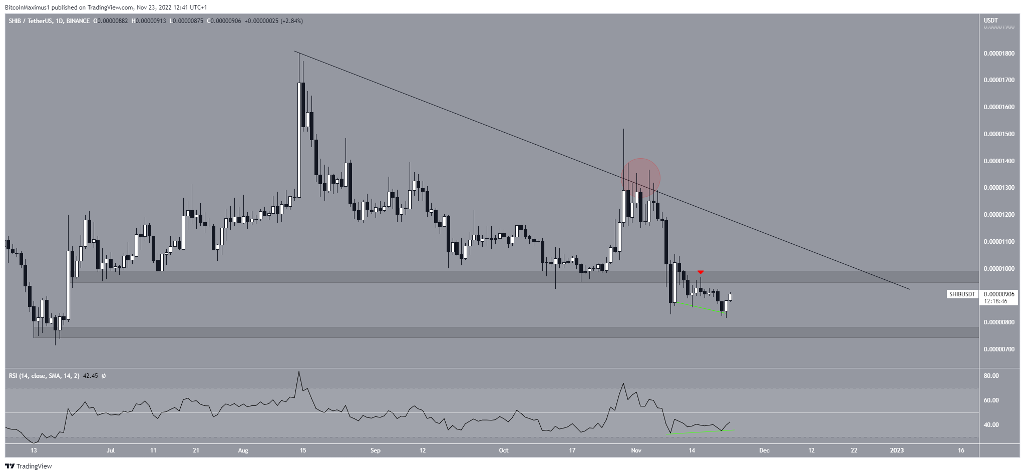 The Shiba Inu price has decreased underneath a descending resistance line since Aug. 15. The line caused several rejections at the beginning of Nov.(red circle), initiating a downward movement that has also been seen in the rest of the cryptocurrency market.