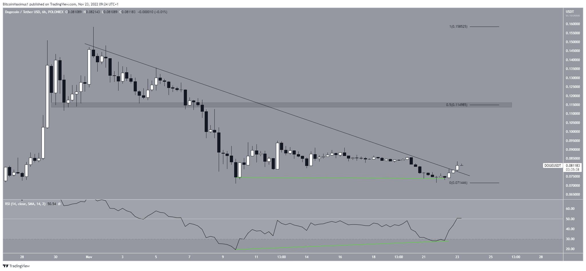 Prior to the breakout, the DOGE price created a double bottom pattern, which was combined with bullish divergence in the RSI (green line).