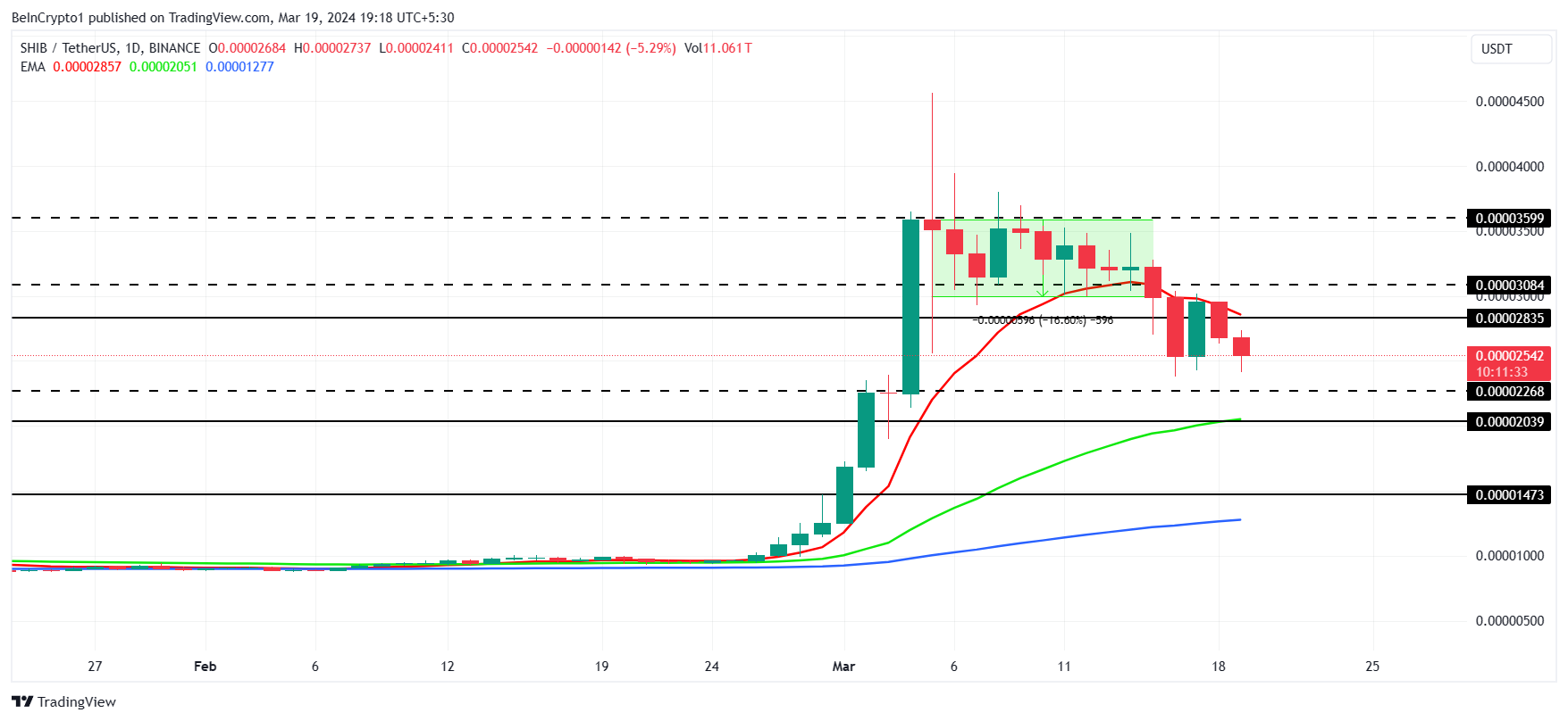 Shiba Inu price is trading at $0.00002542 at the time of writing, after the meme coin failed to reclaim the support of $0.00002800. The increasing bearishness is due to the broader market bearish cues triggered by the decline in Bitcoin price.