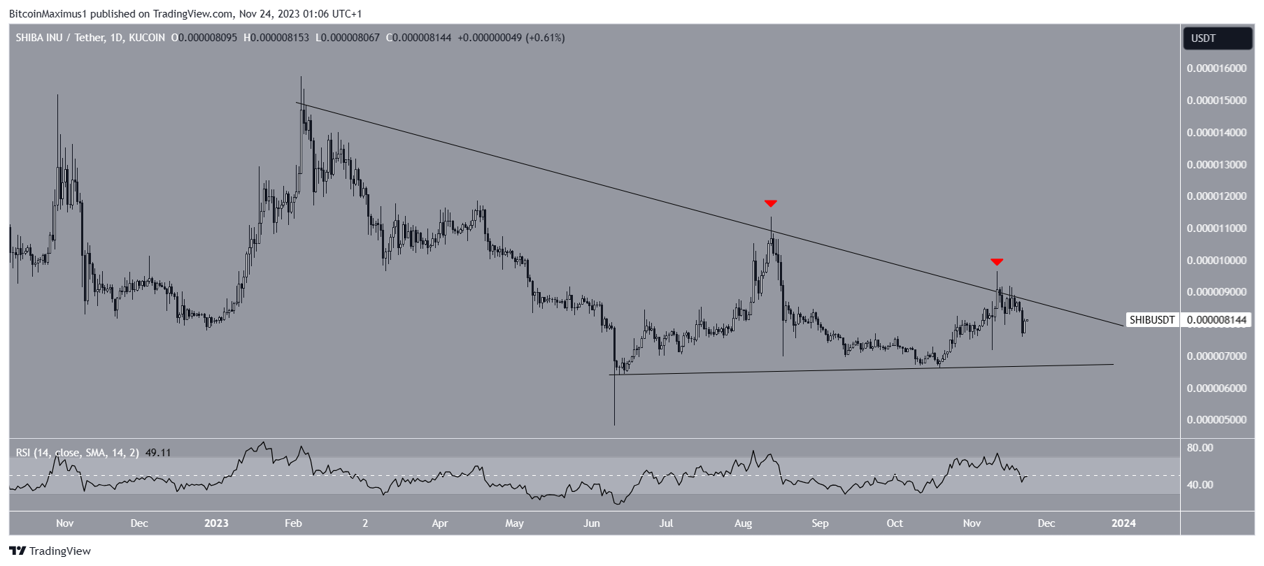 The technical analysis of the daily timeframe shows that the SHIB price has fallen under a descending resistance trend line since the start of the year. The trend line rejected the price twice, most recently on November 11, creating successive lower highs.