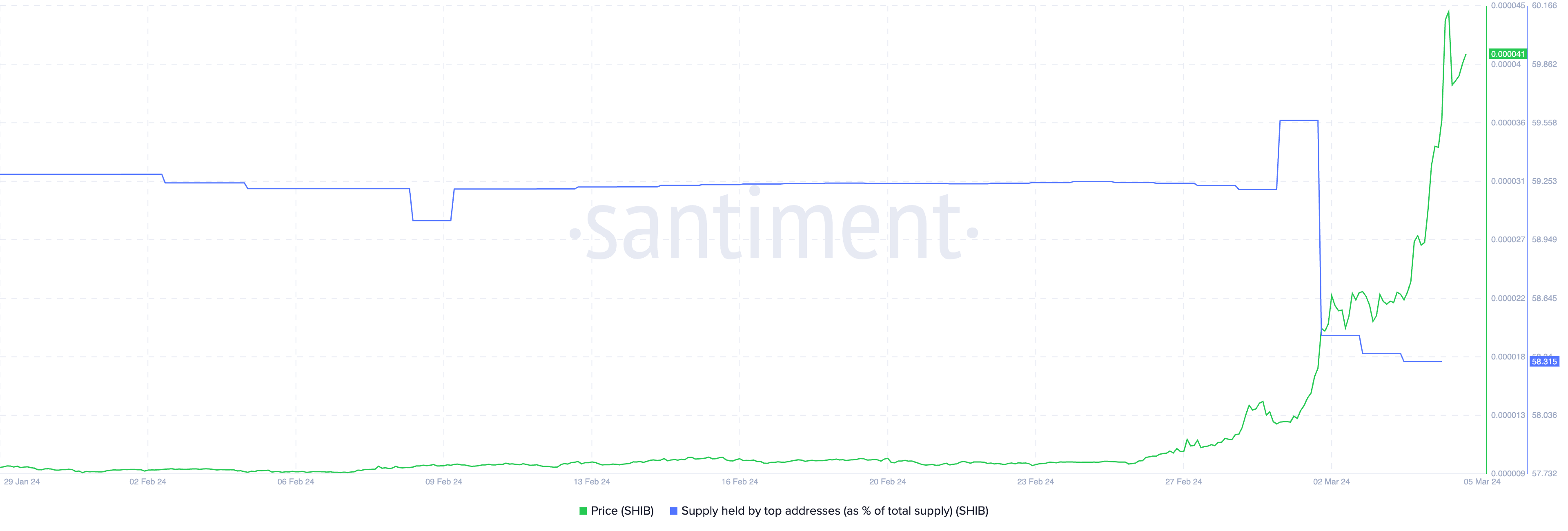 Currently, 58.31% of the total supply of SHIB is held by top addresses, a slight decrease from 59.55% just three days prior. This modest decline occurred alongside a price surge, yet the data confirms that top addresses maintain their SHIB holdings.