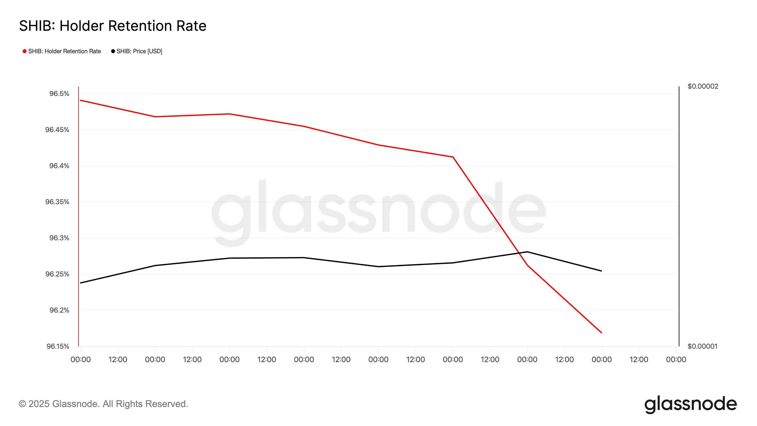 On-chain data from Glassnode confirms the growing skepticism among investors. According to the analytics platform, SHIB’s Holder Retention Rate has steadily declined over the past week and now sits at a 53-day low of 96.16%.
