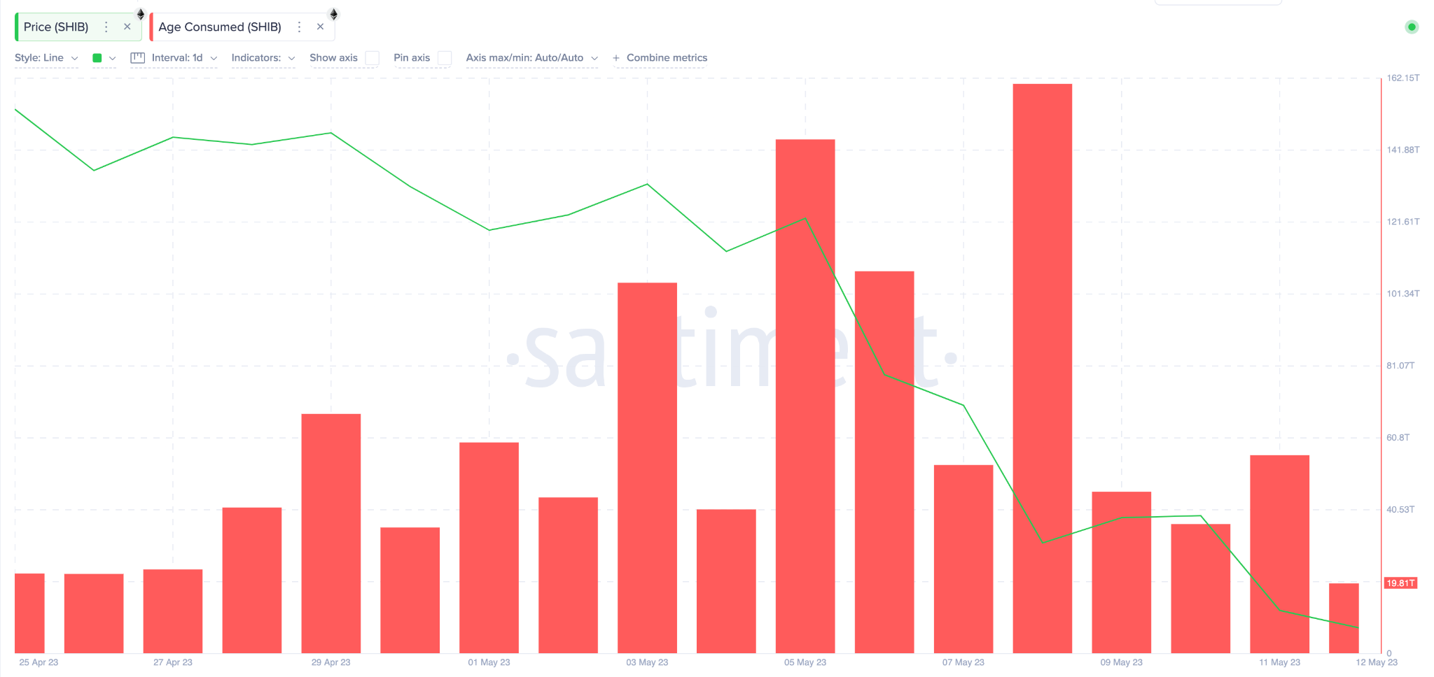 Indicatively, SHIB Age Consumed has declined 65% from 160.55 trillion on May 8 to 55.91 trillion at the close of May 11.