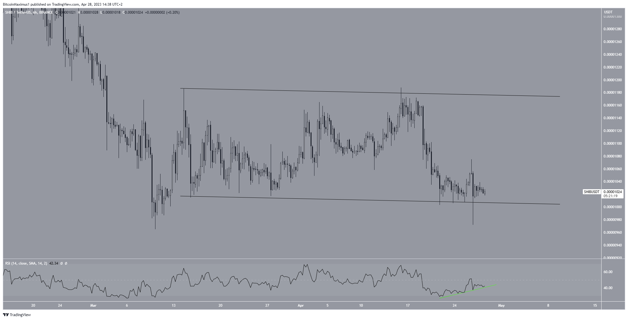 If the price rebounds at the pattern’s support line, it could potentially reach a maximum price of $0.0000170. However, if it breaks down from the support line, it is expected to drop to $0.00000850.
