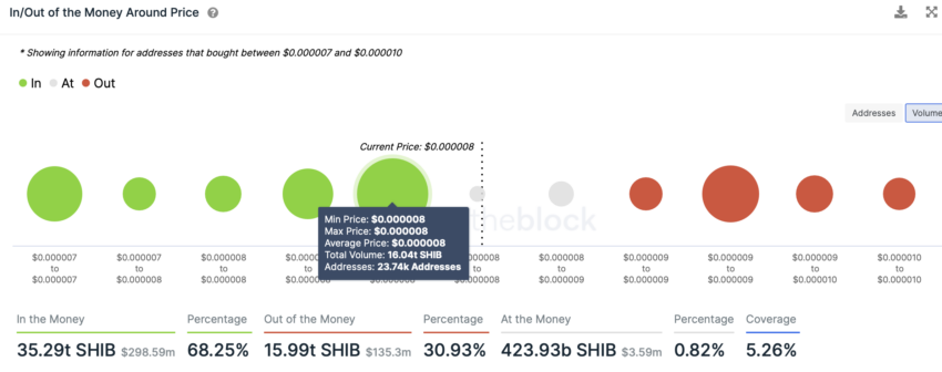 SponsoredIntoTheBlock’s In/Out of Money Indicator suggested that for now, the $0.000008 mark, where 23,740 addresses hold 16.04 trillion SHIB, can act as a strong support.