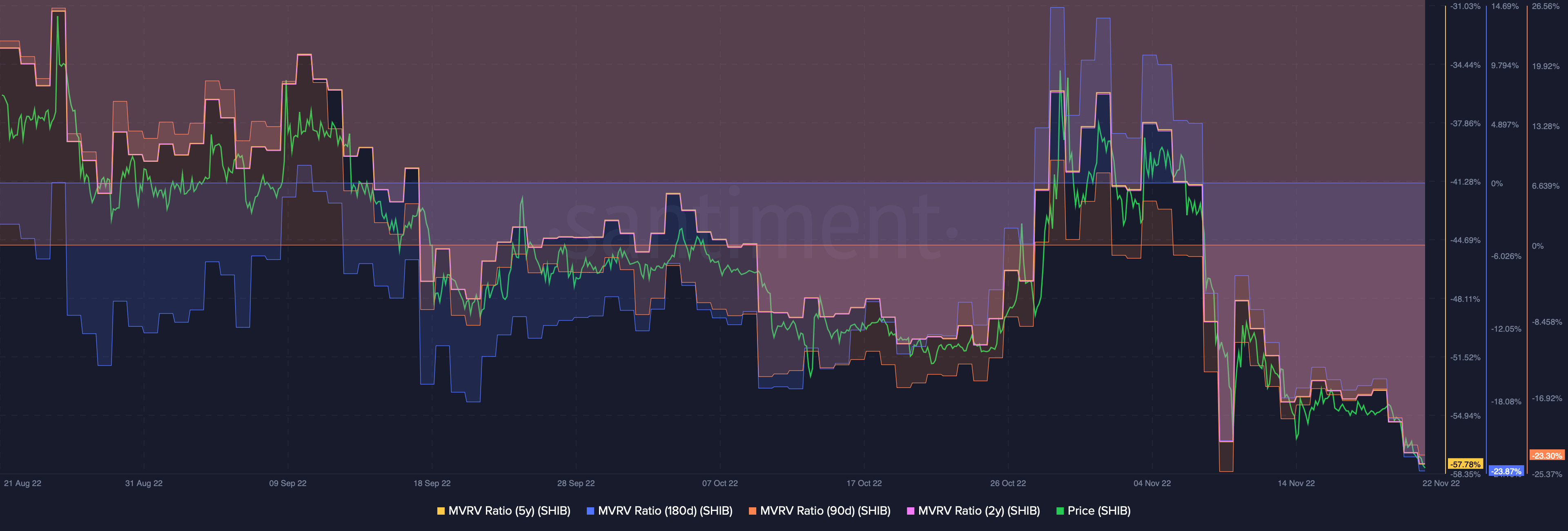 A look at SHIB market-value to realized value (MVRVs) showed that long-term Shiba Inu holders were underwater. Notably, five-year, two-year, 180-day, and 90-day MVRVs were negative for SHIB presenting long-term holders’ pain.