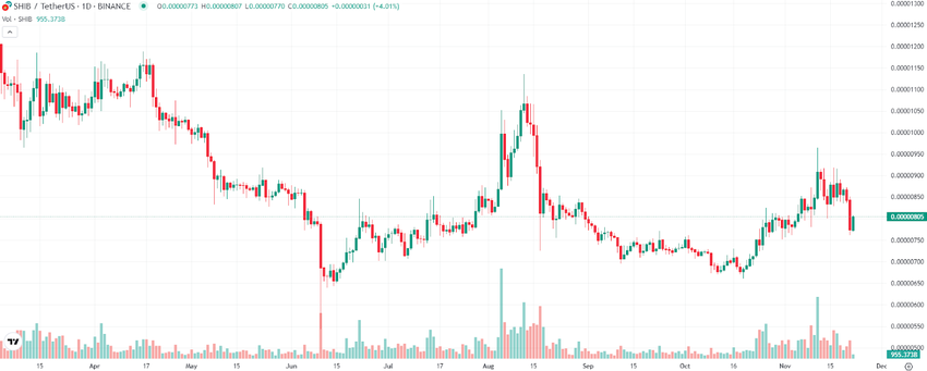 The price of popular meme coin Shiba Inu (SHIB) plunged 4% today, with the token now trading around $0.000008.