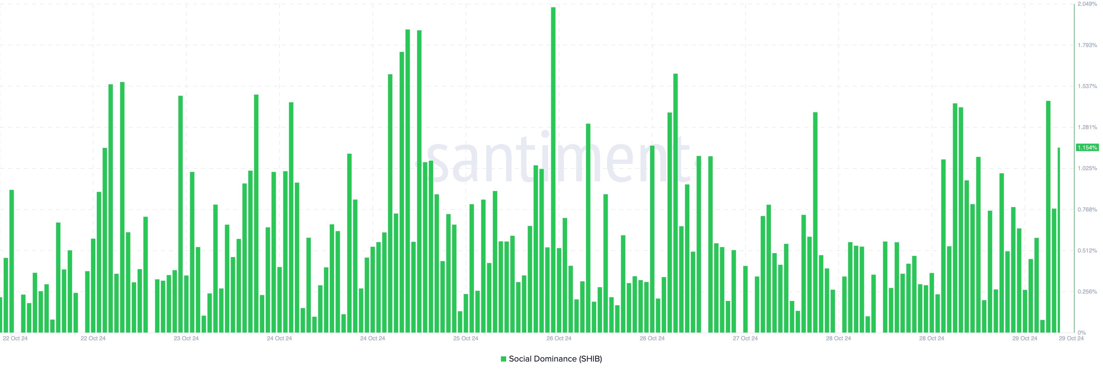 If sustained, this could put upward pressure on SHIB’s price. Shiba Inu’s social dominance is another factor that could influence its potential for further gains.