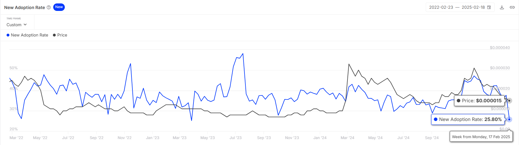The adoption rate for Shiba Inu has recently dropped to a four-year low. Over the past two months, SHIB has failed to deliver significant growth, making it less enticing for new investors. This decline in adoption reflects a waning interest in the token, as potential investors are hesitant to commit to an asset showing minimal movement.