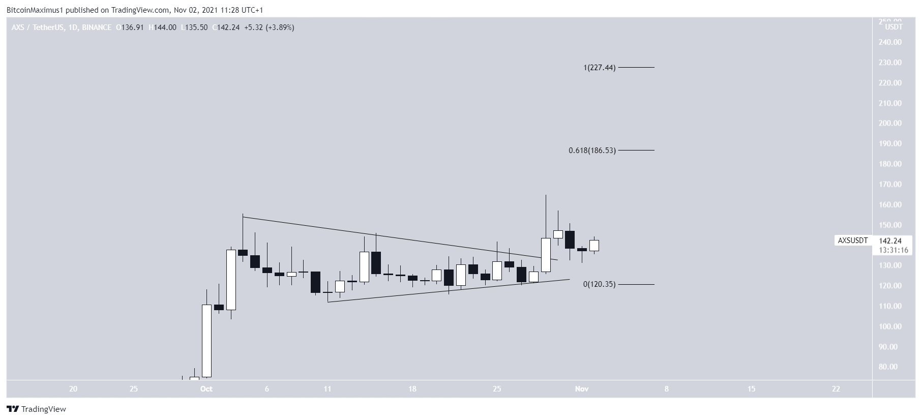 AXS managed to break out of this pattern on Oct 31. The next resistance levels would be found at $186.50 and $227.50. The first would give the current and previous upward moves a 0.618:1 ratio while the second would give them a 1:1 ratio.