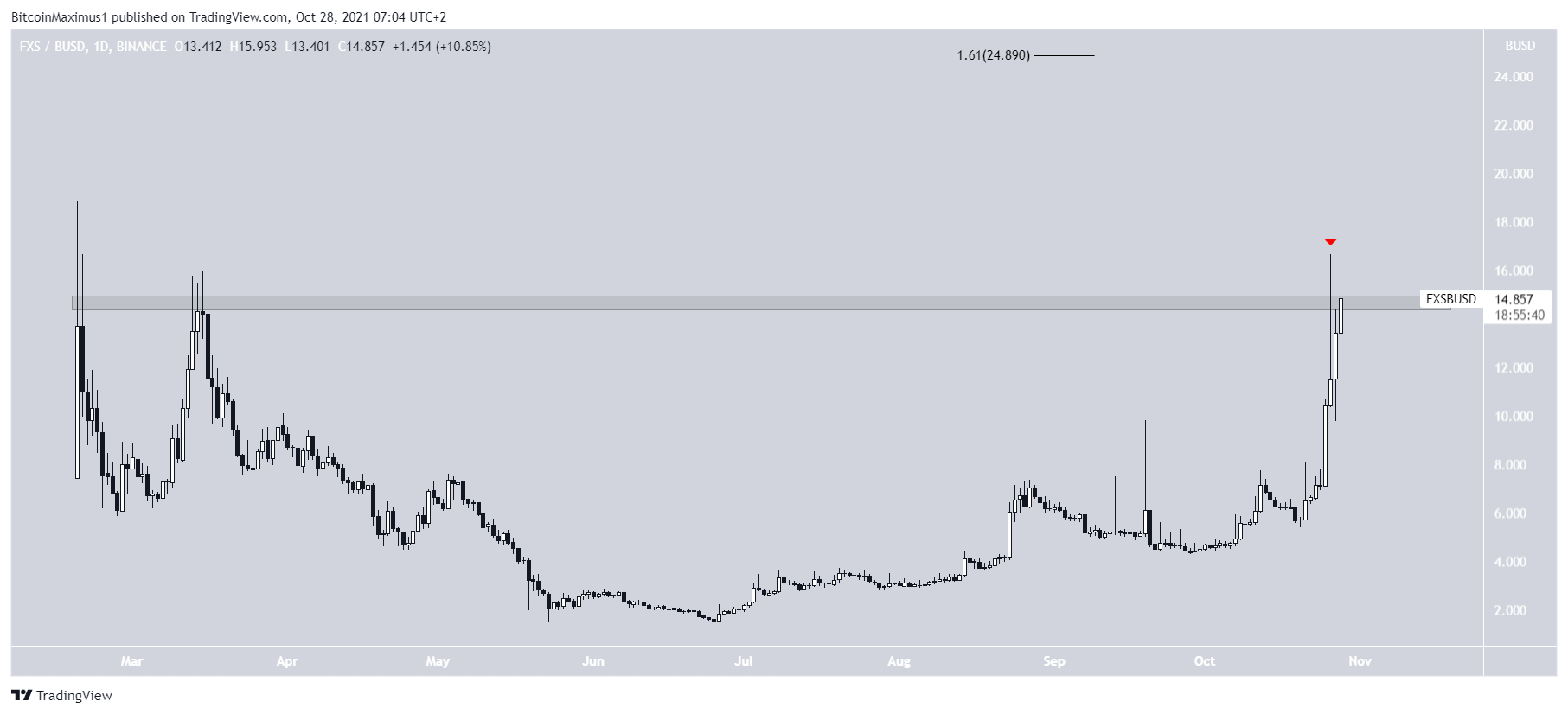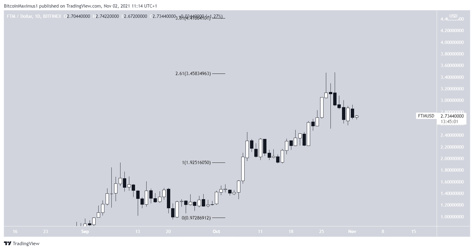 Similar to both SHIB and FXS, the FTM rally greatly accelerated on Oct 22. On Oct 26, FTM was rejected by the 2.61 external Fib retracement level at $3.45.