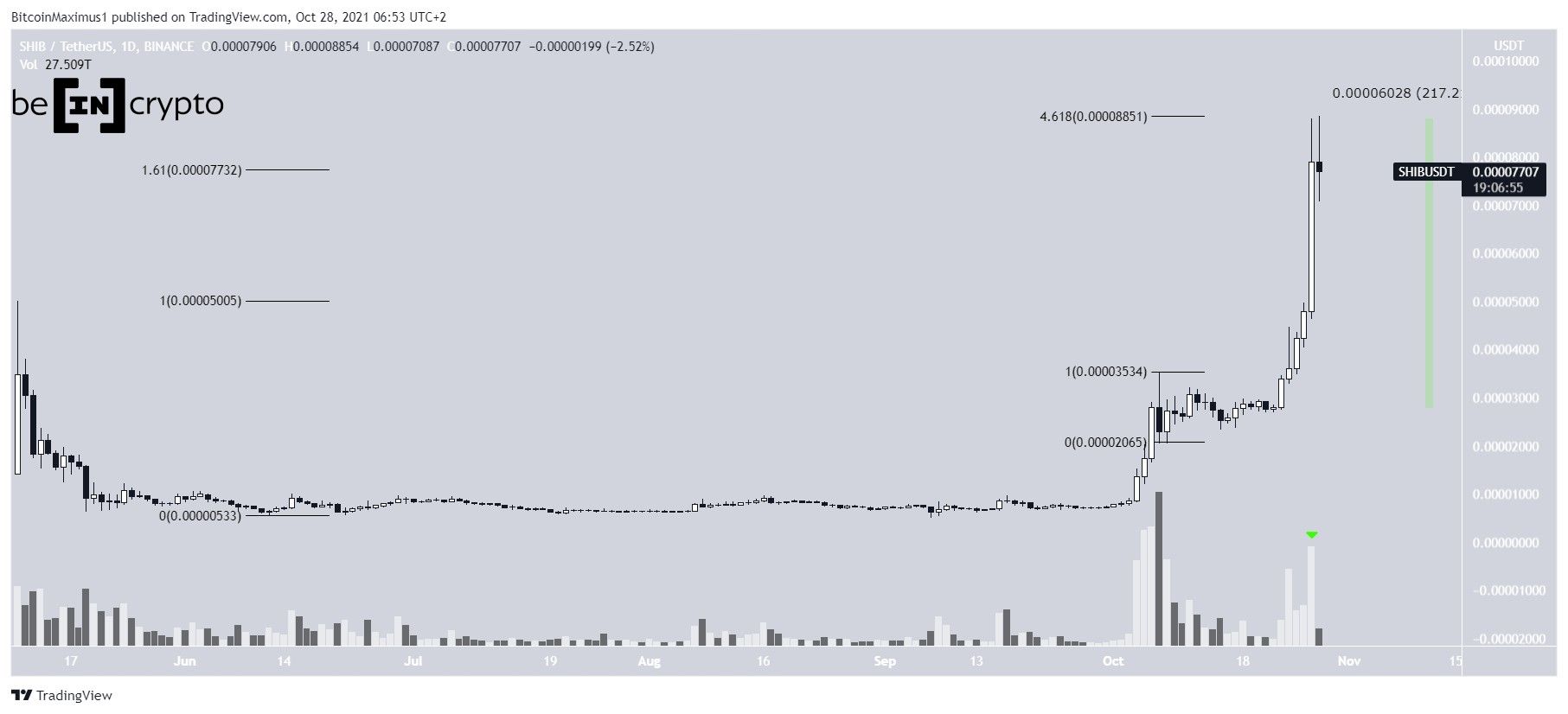 SHIB has been moving upwards since the beginning of October. It has massively accelerated since Oct 23. In a span of only four days, SHIB increased by 217%.