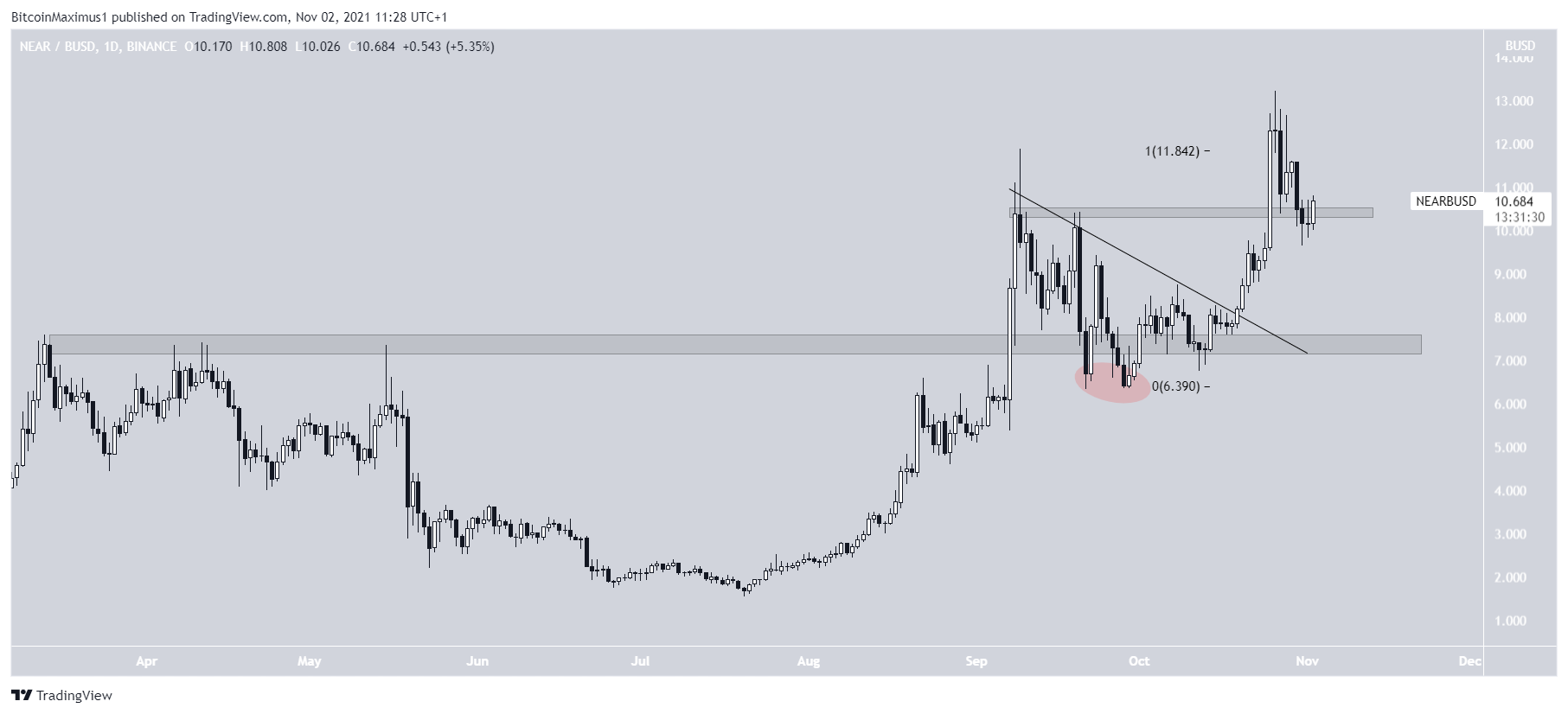 NEAR reached a new all-time high price of $13.22 on Oct 26. The next day, it bounced at the $10.55 support area and initiated yet another upward move. However, it was unsuccessful and returned to the $10.55 area once again.