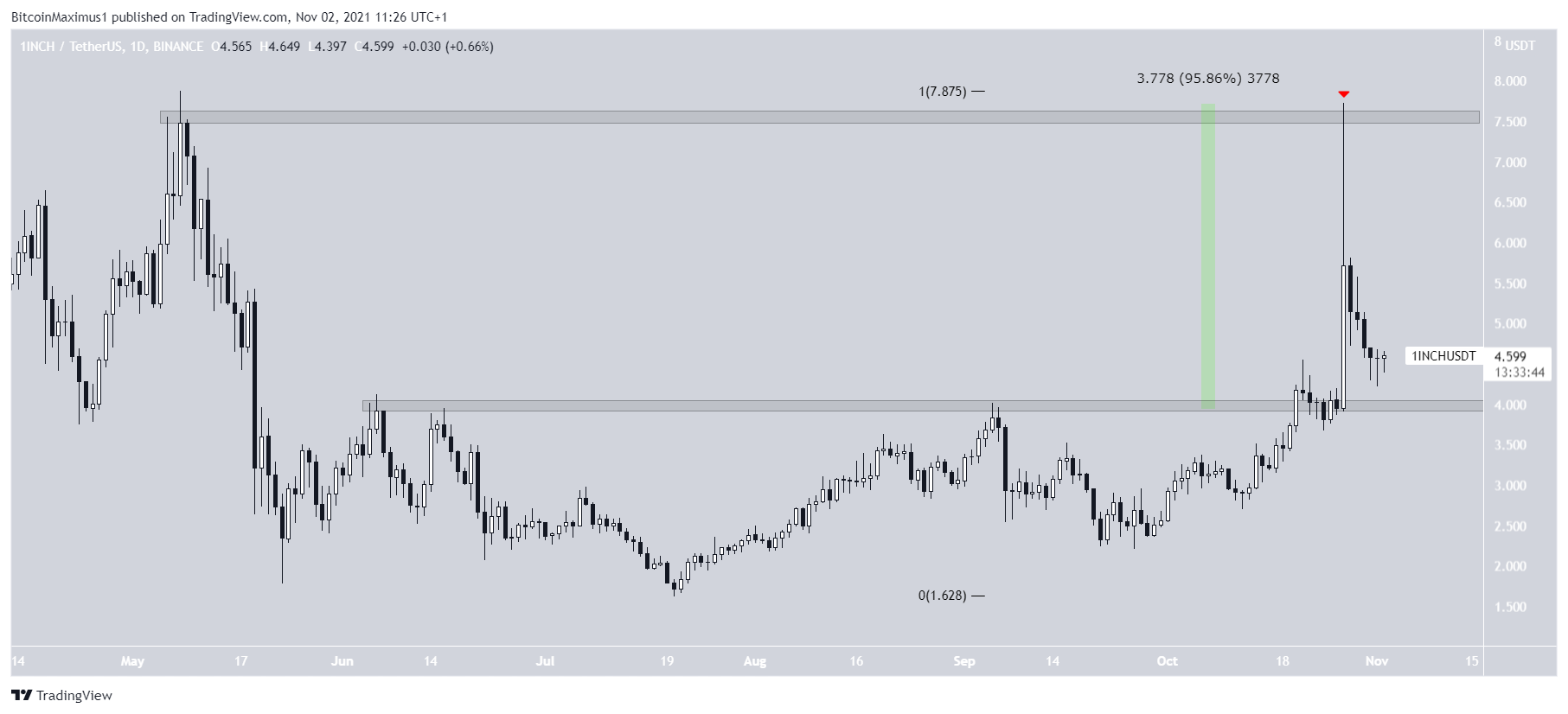 1INCH made a huge move to the upside on Oct 27, at one point reaching a magnitude of 95%. This only barely failed to create a new all-time high price, falling short by $0.12.