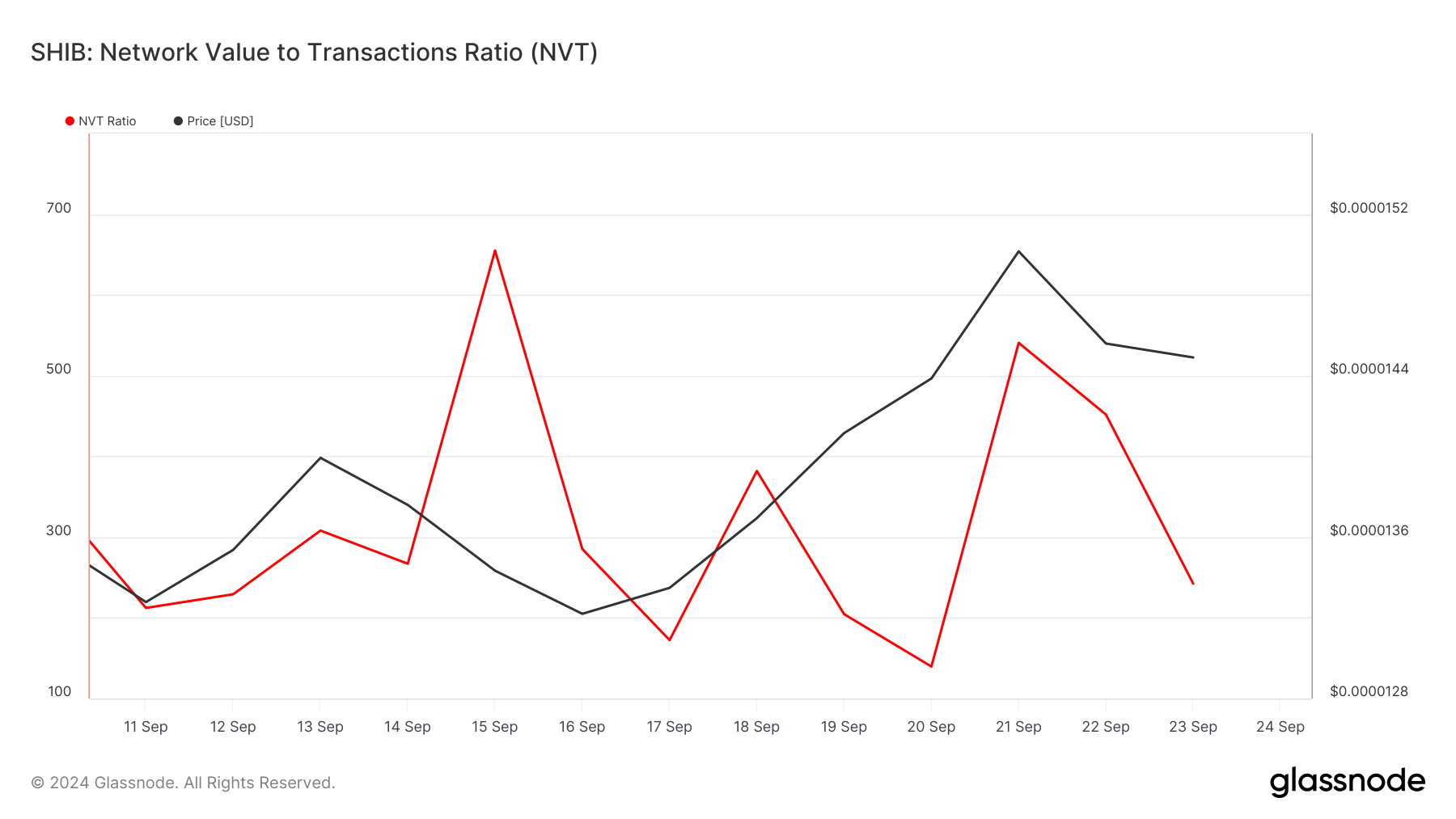 High values of the NVT ratio indicate higher market cap growth and typically signify that the price has hit the local top. Since the NVT ratio fell in SHIB’s case, transaction volume appears to be outpacing market cap growth, indicating that the price is at a good buying point.