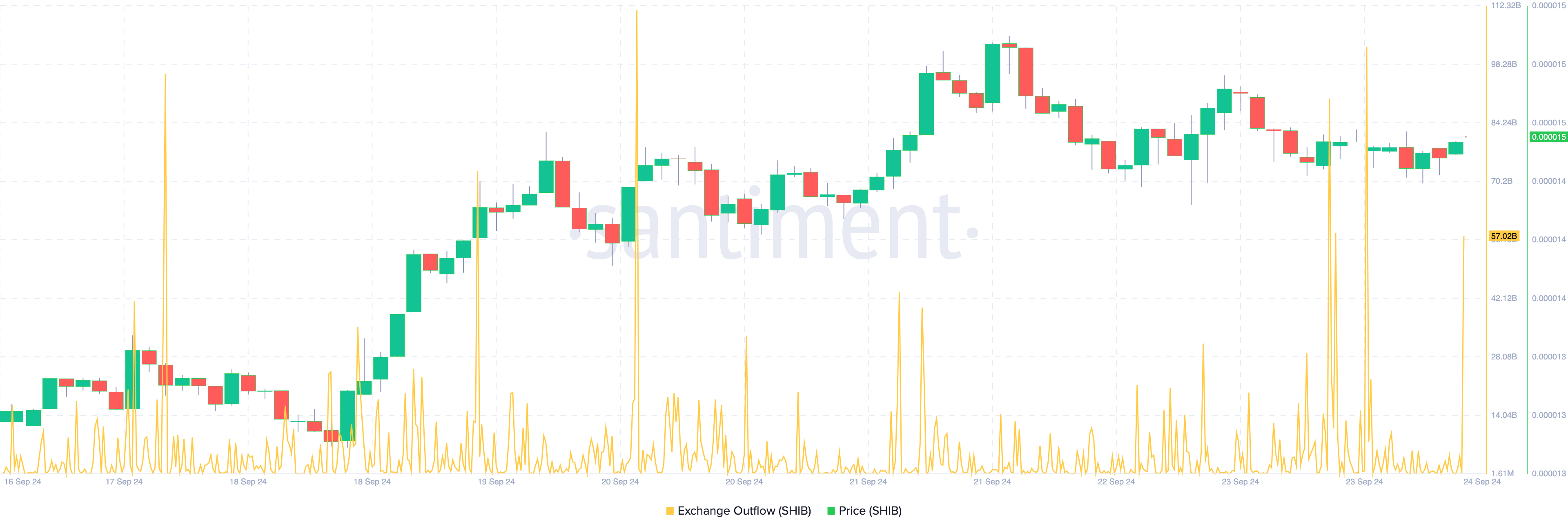 On September 23, Shiba Inu’s exchange outflow was less than 4 billion. Today, the same metric spiked to 57.02 billion, according to Santiment data.