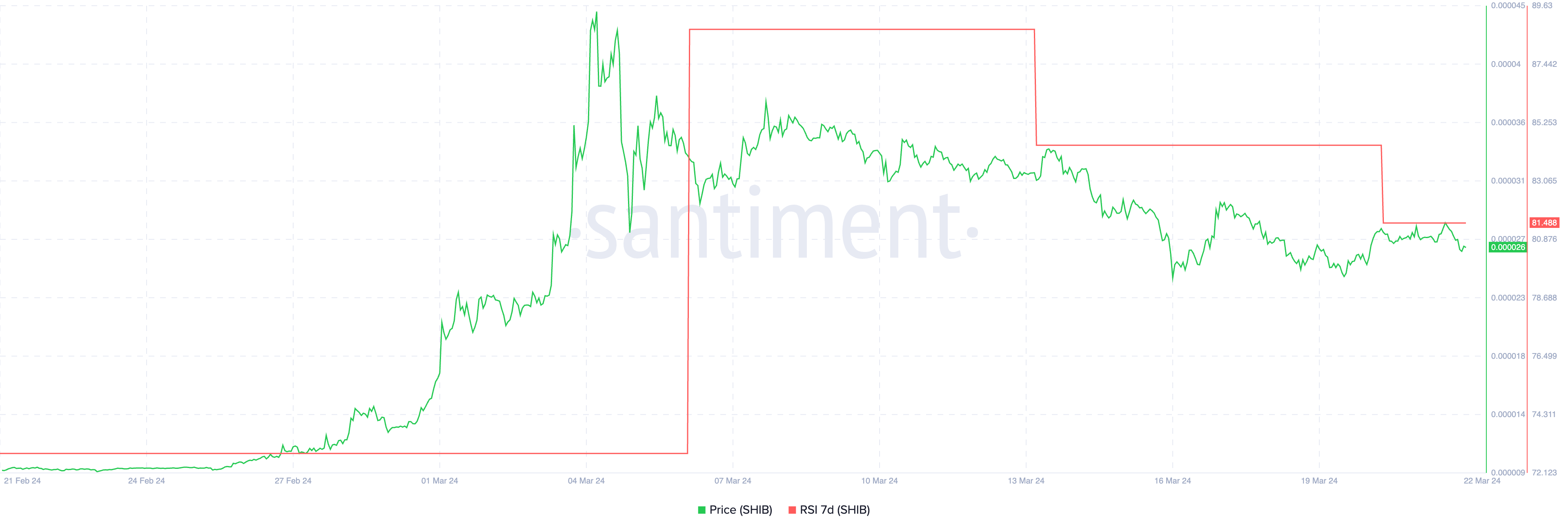 The RSI metric itself serves as a crucial tool in technical analysis, acting as a momentum oscillator that measures the speed and change of price movements within a range of 0 to 100, based on recent price increases and decreases. SHIB’s RSI progression from 88 on March 11 to 81 by March 21, despite reflecting a modest reduction in buying momentum, unmistakably keeps it within the overbought territory.