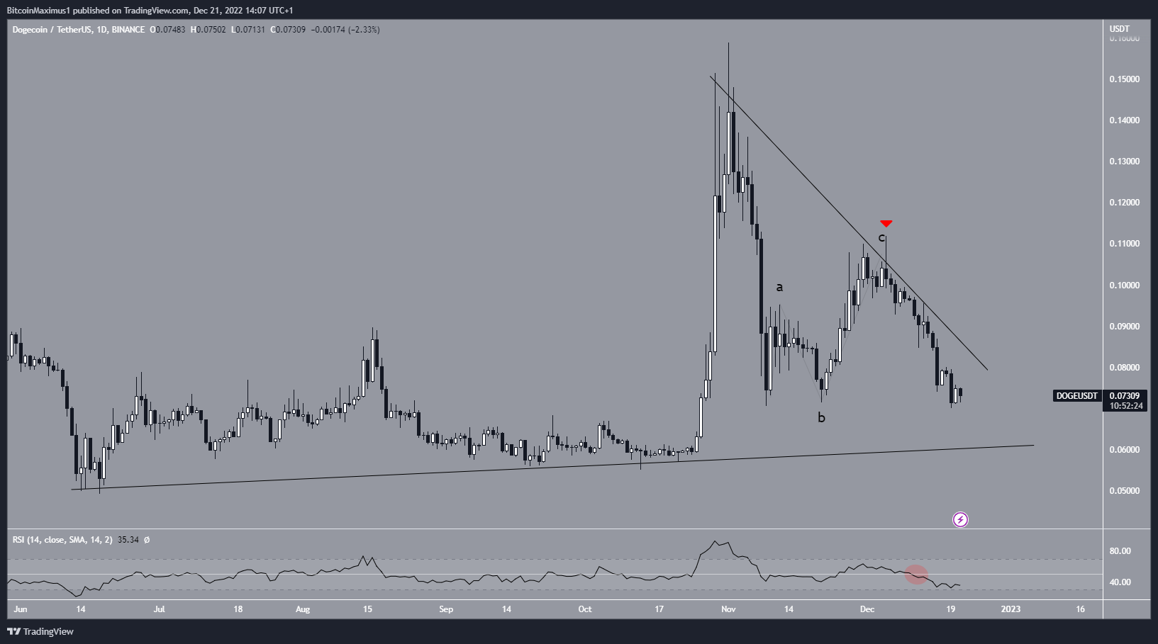 However, the DOGE price has already been mired in a decrease below a descending resistance line since Nov. 1. The resistance line caused a rejection on Dec. 5 (red icon), accelerating the rate of decline. This led to a low of $0.069 on Dec. 19.