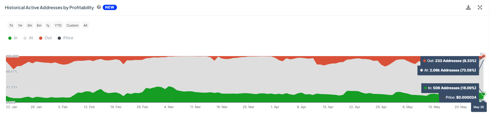 SHIB holders are uncertain of a rise, which is evident in their behavior. The investors are high on selling their holdings to secure whatever gains they can. Upon observing the active addresses by profitability, one can note that about 20% of all investors conducting transactions on the network are in profit.
