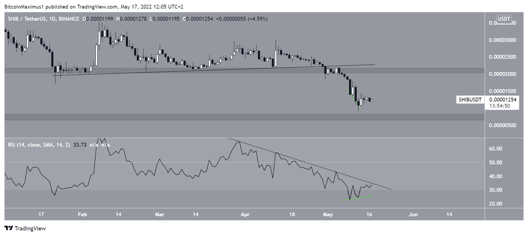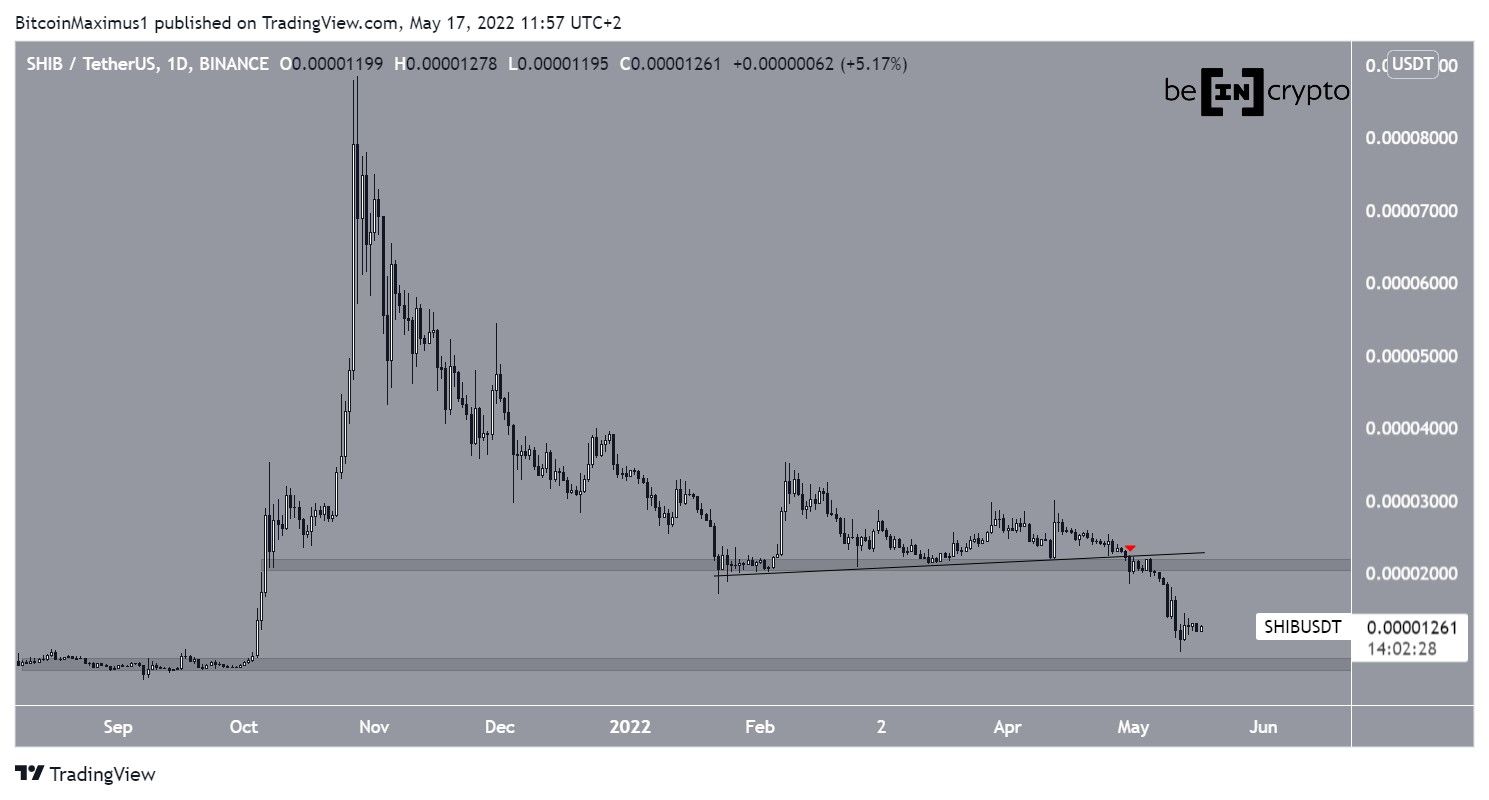 However, on April 30 (red icon), it broke down from both the ascending support line and the $0.000021 horizontal support area. In turn, this led to a low of $0.000009 on May 12.