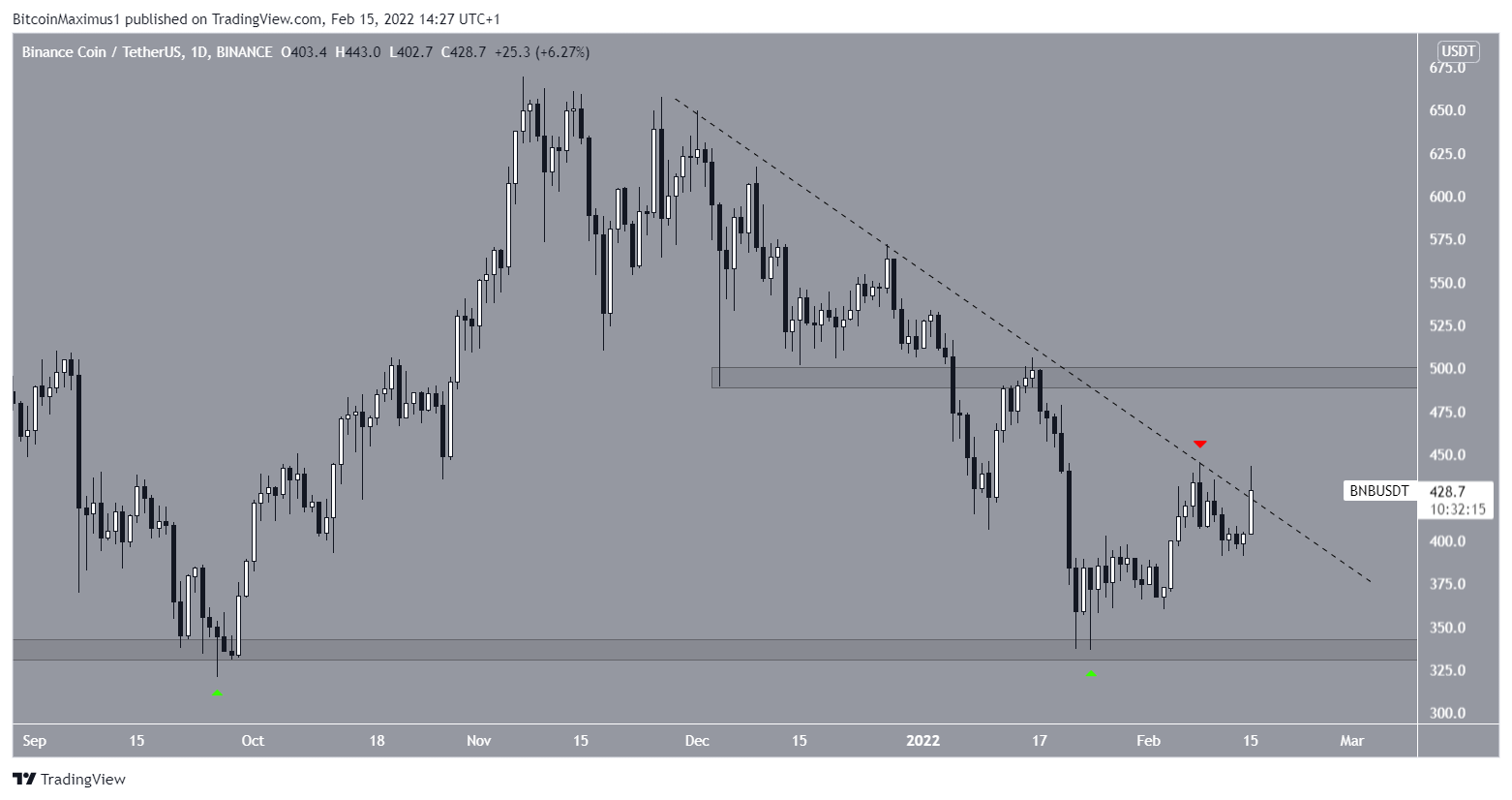 BNB has also been following a descending resistance line since Dec. However, it has yet to break out from it. More recently, it was rejected by the line on Feb 13 (red icon). However, it is in the process of breaking out once more.