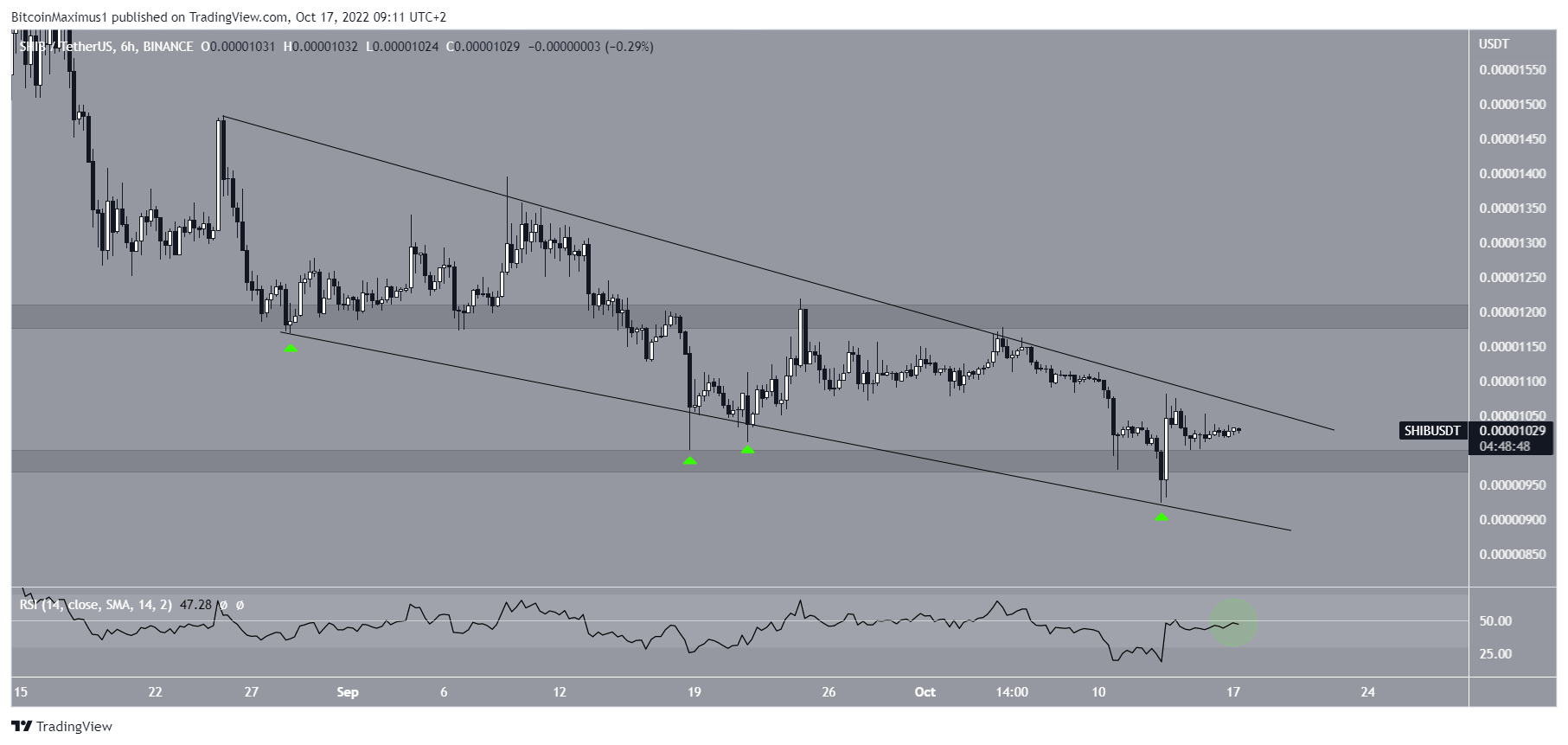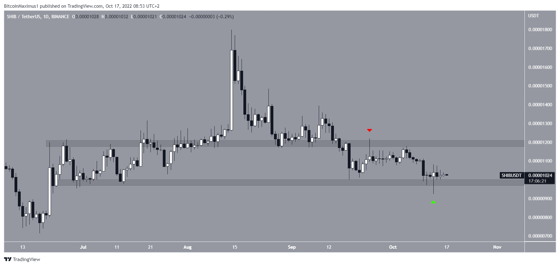The SHIB price has been moving downwards since Aug. 14, when it reached a high of $0.00001800. So far, the movement has led to a low of $0.00000924 on Oct. 14.