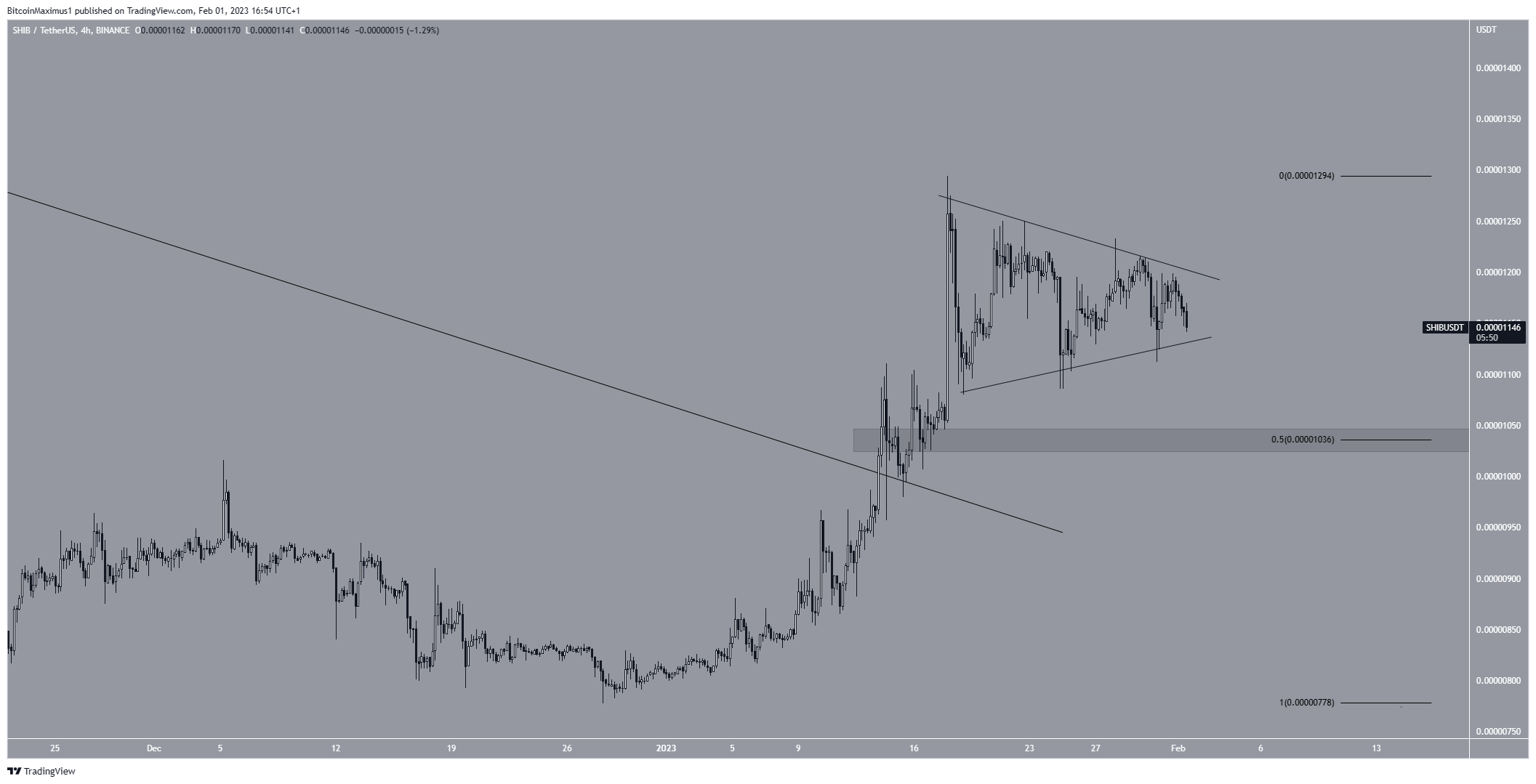 A breakdown from the triangle would invalidate this bullish Shiba Inu price prediction for February. In that case, the Shiba Inu price could fall to the 0.5 Fib retracement support level at $0.0000103, which is also a horizontal support area.