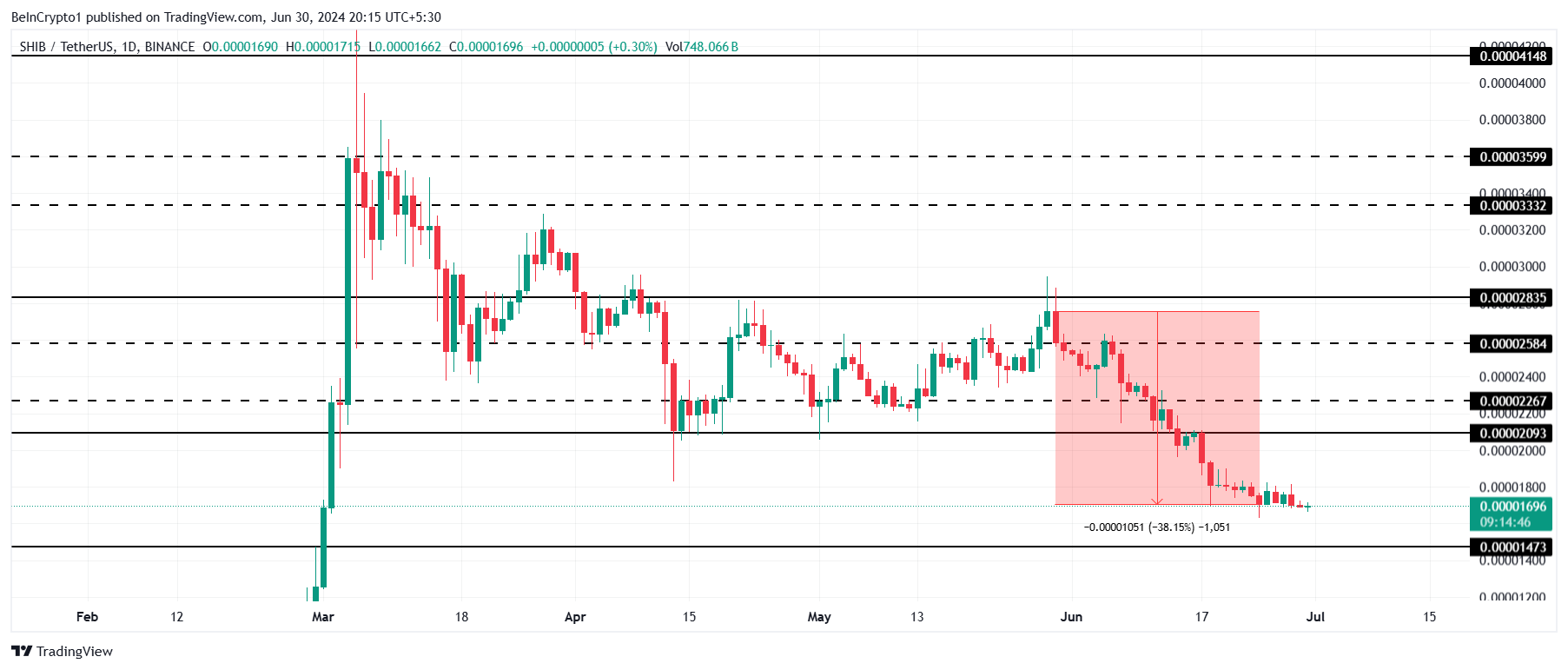 Shiba Inu’s price, trading at $0.00001696, is suffering the bearish cues of the near 40% drawdown noted throughout June. As the meme coin fell out of the consolidation zone between $0.00002584 and $0.00002267, it created room for losses.