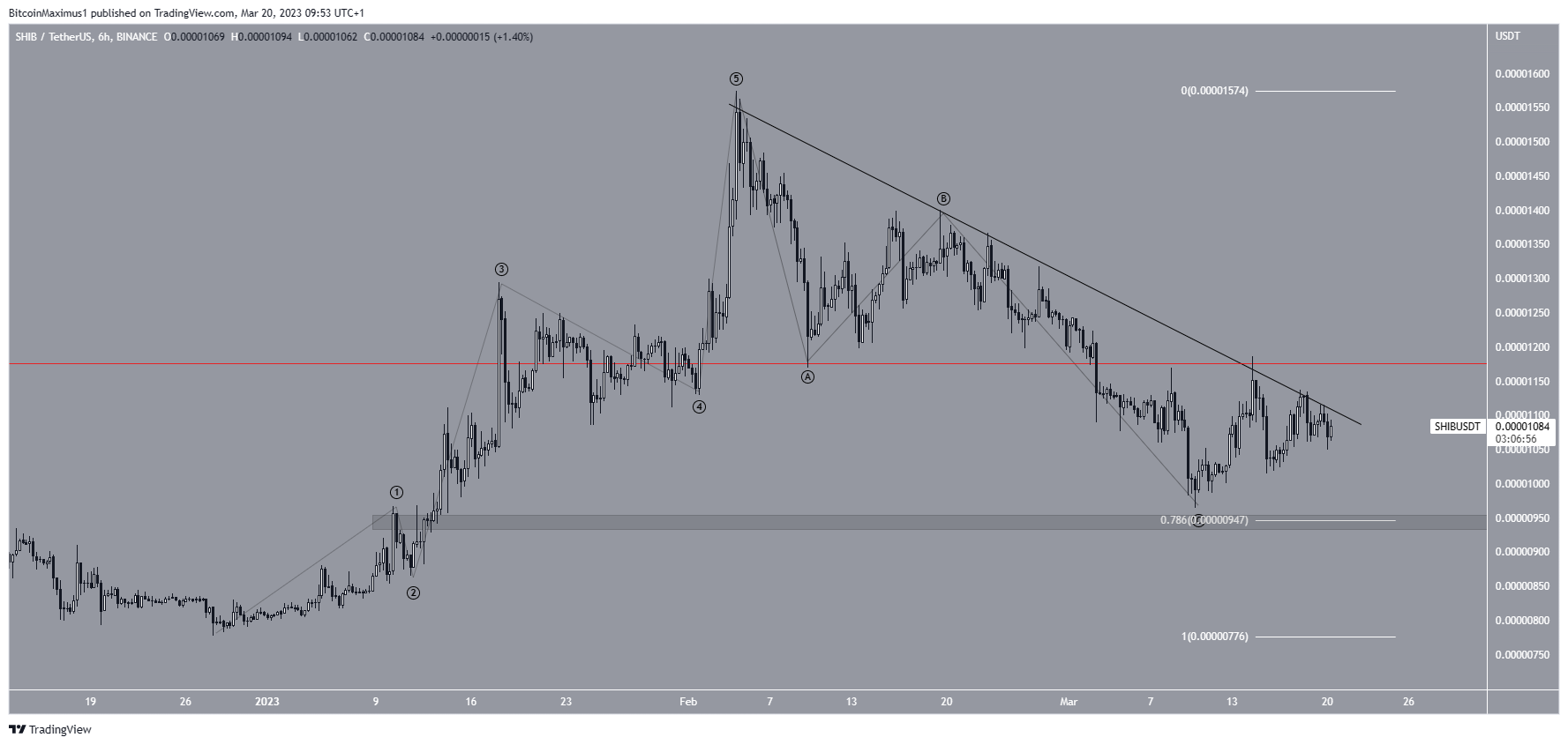 The six-hour time frame technical analysis indicates that the SHIB price may have completed an A-B-C correction after a five-wave upward movement.