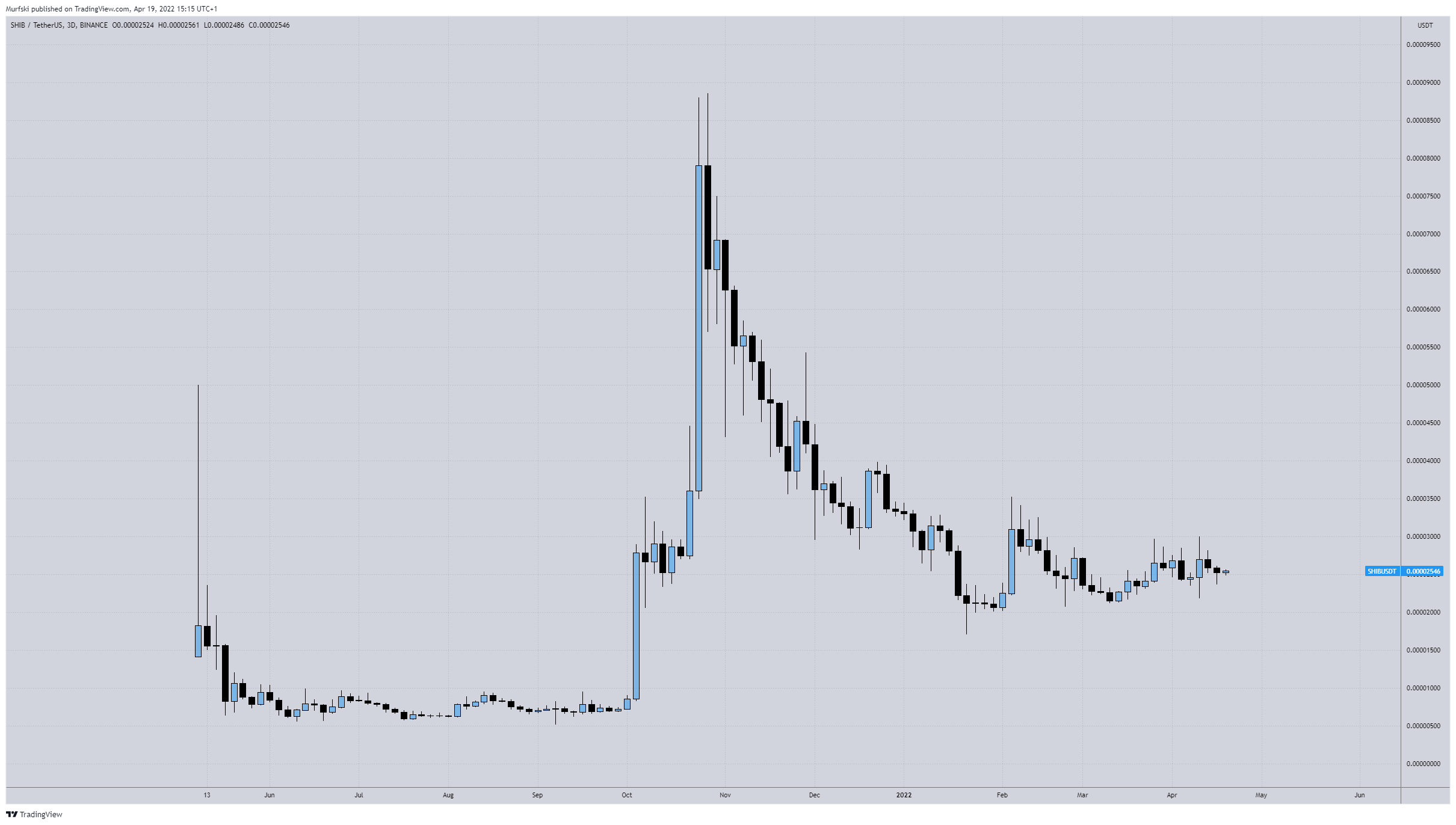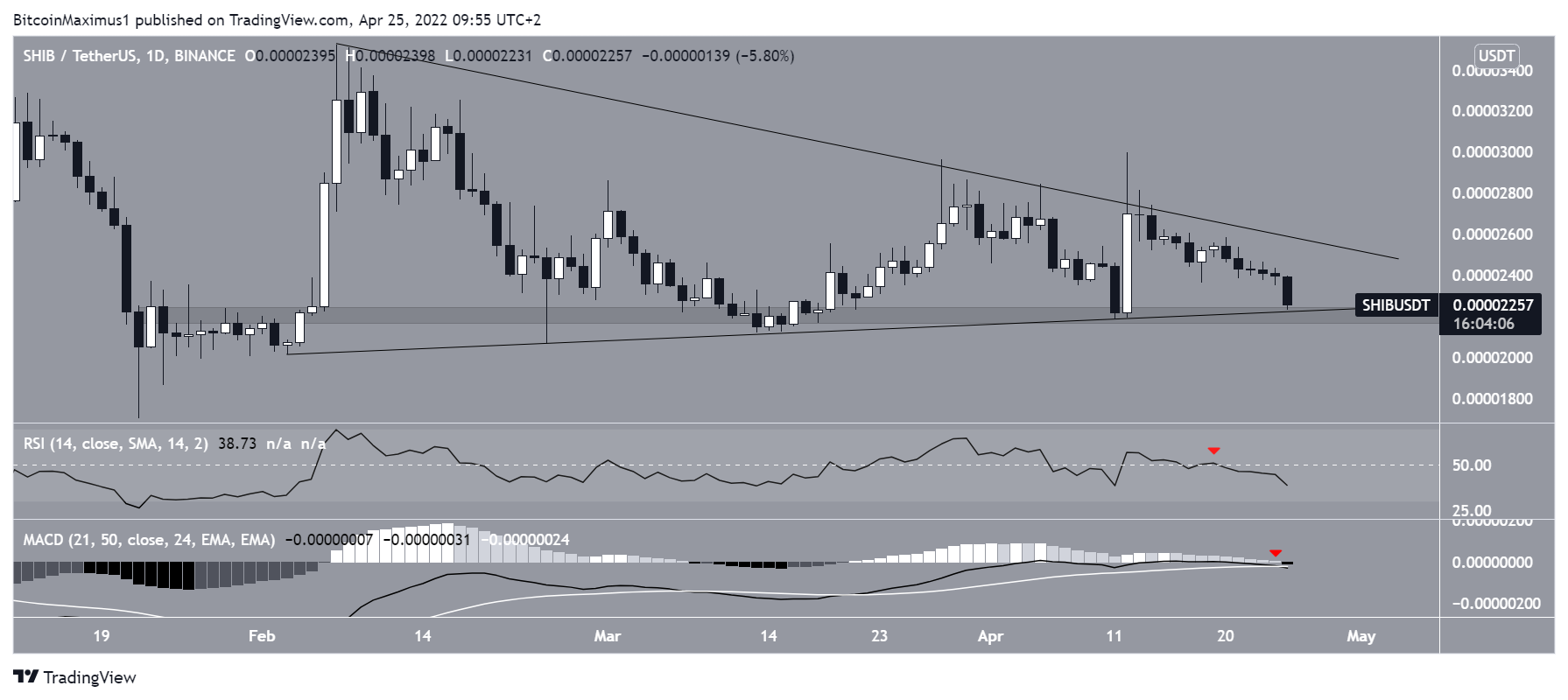However, a movement that travels the entire height of the pattern could potentially take SHIB all the way back to $0.0000060. A drop to this level would completely negate the entire upward move that began in October 2021.