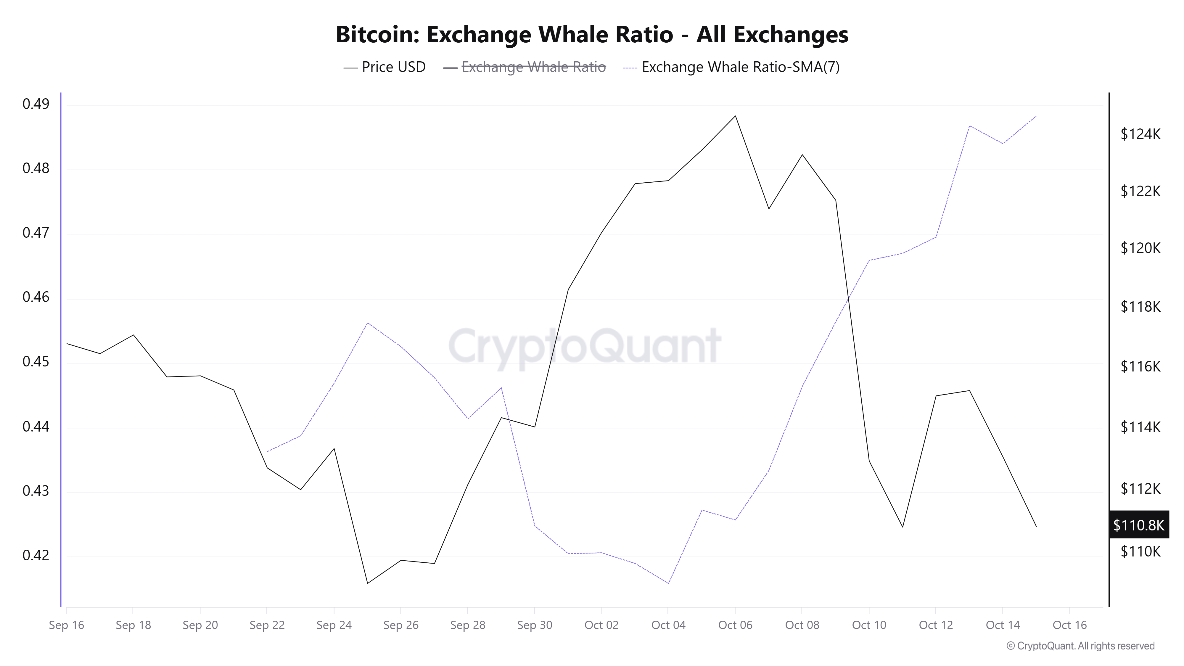 Another key metric is the Exchange Whale Ratio, which measures the proportion of the top 10 inflow transactions relative to total inflows on exchanges.