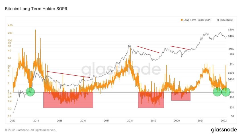 In a chart of the long-term SOPR going back to 2013, we again see the importance of the 1 level. Whenever it fell and stayed below 1, and long-term holders sold at a loss, that’s when a bear market lasted on Bitcoin (red areas and lines).