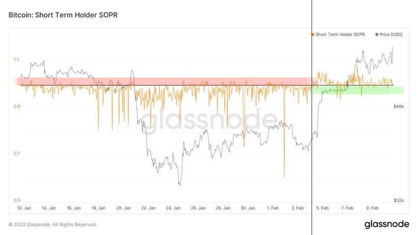 It was only after BTC found a bottom at $32,900 that the SOPR indicator began to rise dynamically and successfully broke through the critical level of 1 on February 7, 2022. This signals that once again the average BTC holder is recording a small profit, choosing to sell at the current price. If the value of the indicator does not break down and stays above 1, it will be a bullish signal. In the past, it has been the beginning of an upward trend on Bitcoin (green arrows and lines).