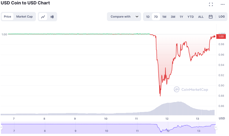 The stablecoin USD Coin (USDC) declined to a low of $0.879 on CoinMarketCap. Circle, the company behind USDC, had $3.3 billion of exposure to SVB, causing concern among investors that the stablecoin may not maintain its peg to the U.S. dollar. Although the $3.3 billion only makes up $40 billion of total USDC reserves.