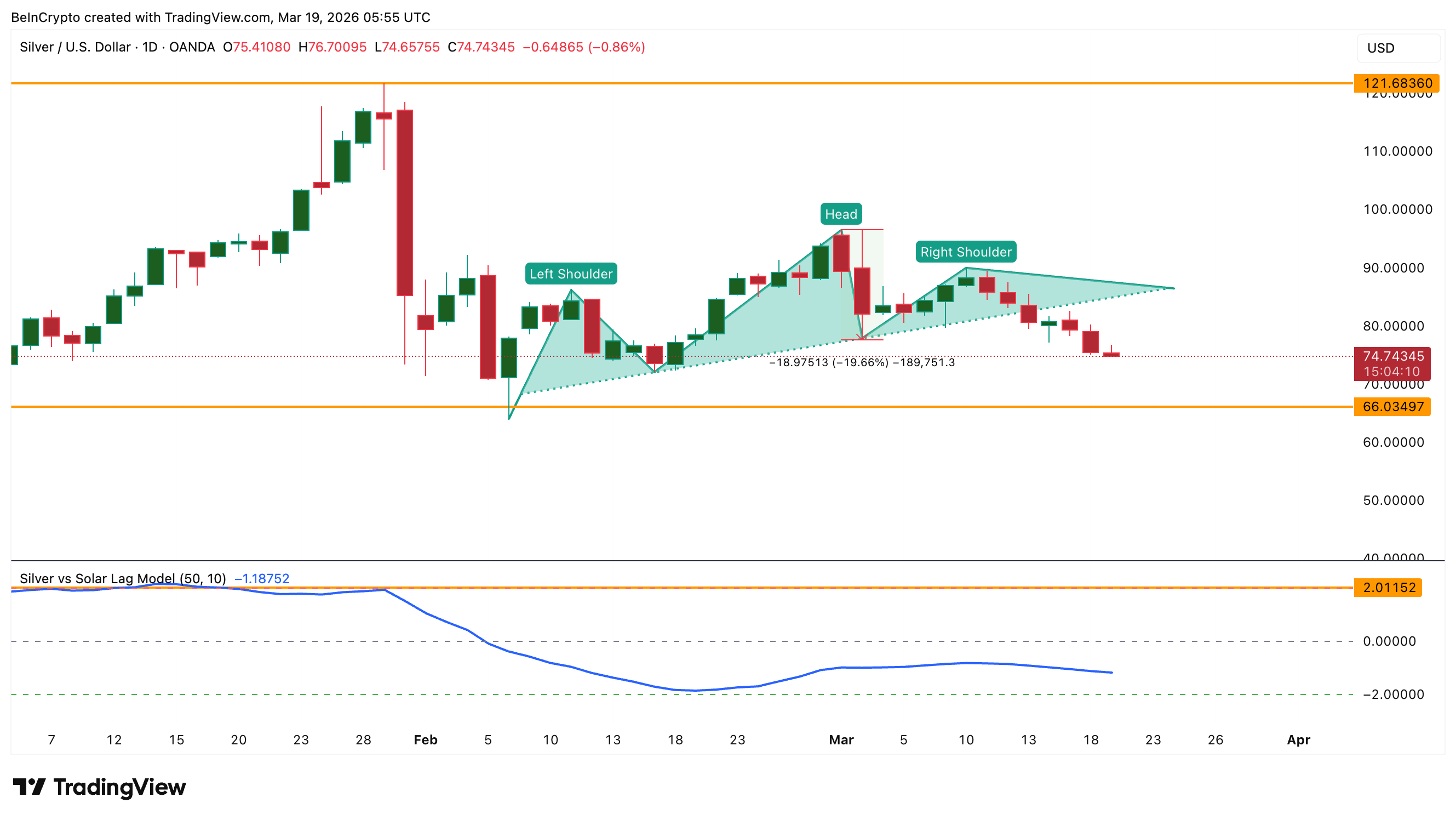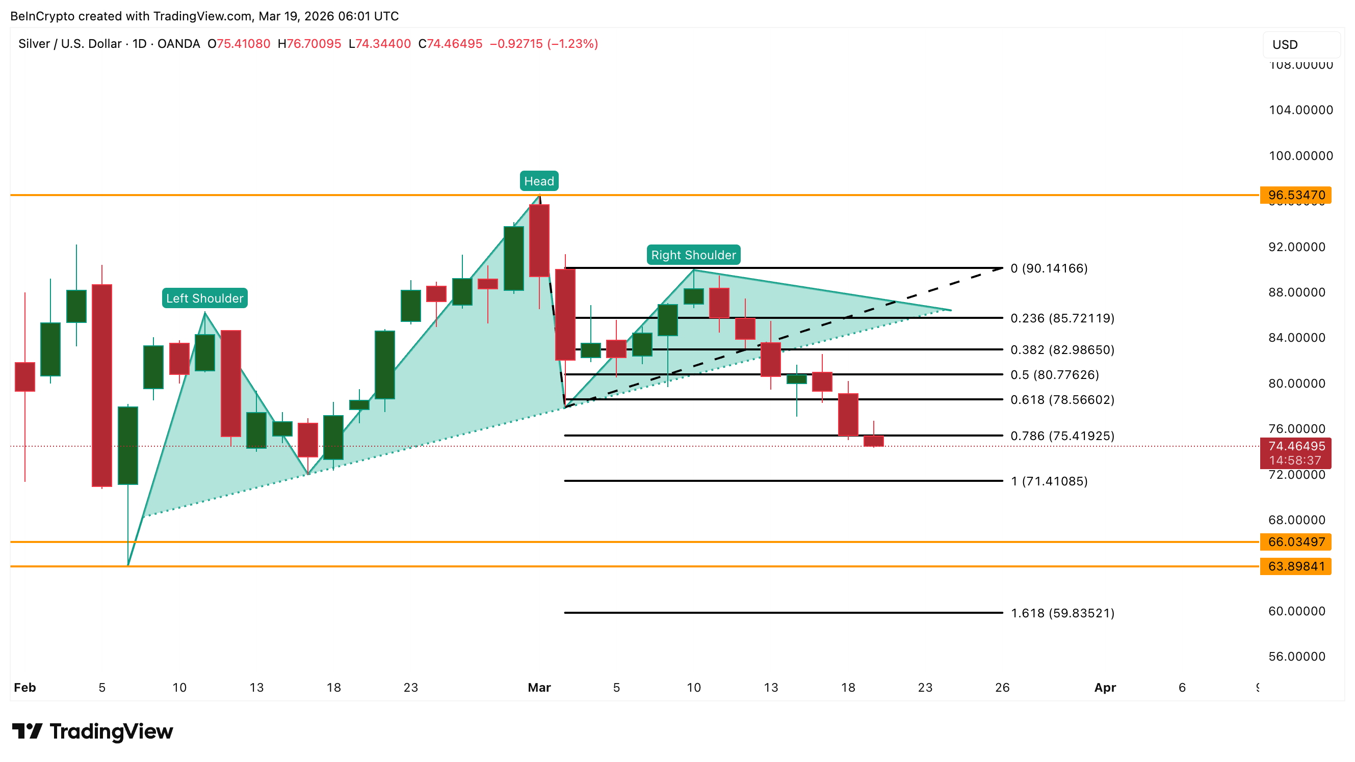 An upward-sloping neckline usually reflects steady buying support. When that support fails, it often leads to sharper declines. That is what silver is now showing. The projected move from this structure points to nearly a 20% drop, with a target near $66. This level sits close to recent lows, keeping further downside firmly in play.