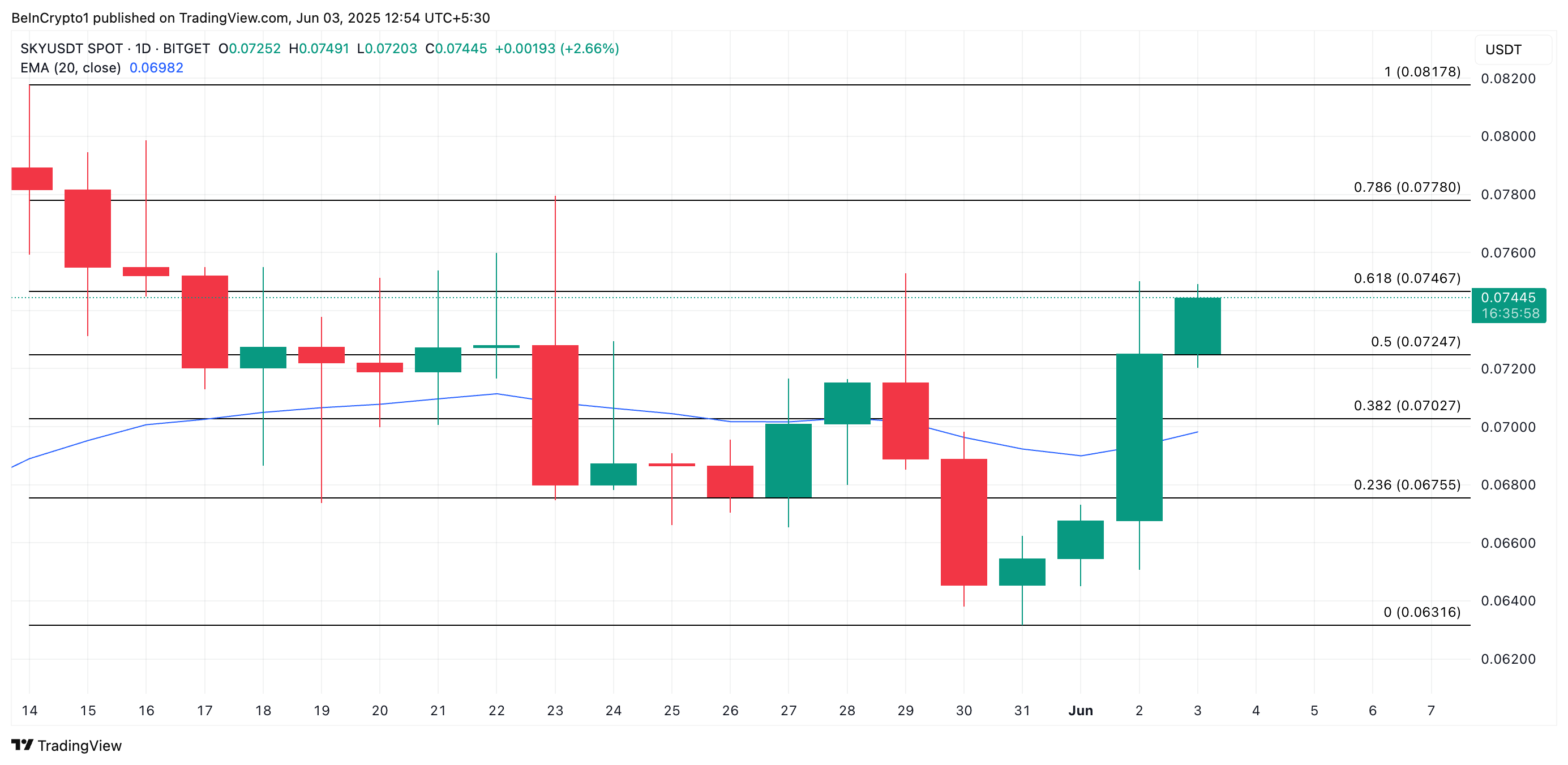 SKY’s double-digit rally has pushed its price above the 20-day exponential moving average (EMA). This key moving average now forms dynamic support below the token’s price at $0.0698.