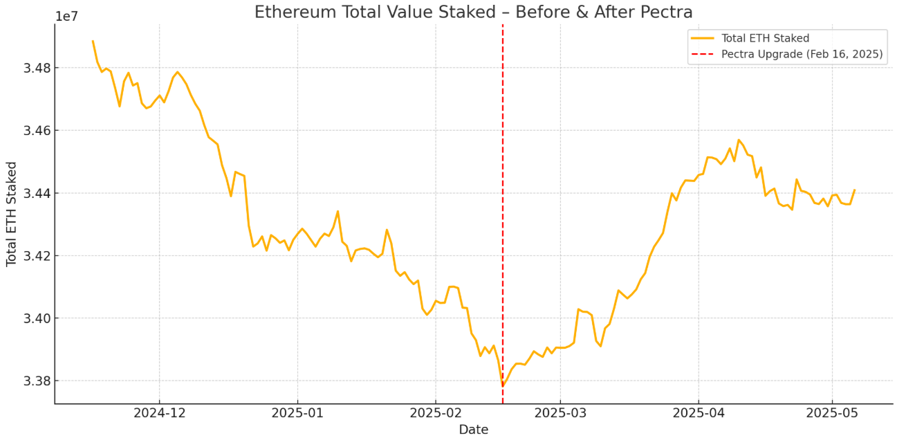 “Before Pectra News (Nov 16 – Feb 15): ETH staking dropped from ≈34.88M to 33.86M ETH, a net outflow of ~1.02M ETH. This period reflects market uncertainty and mild unwinding of staking positions ahead of the upgrade. After Pectra News (Feb 16 – May 16): Total ETH staked rose from 33.78M to 34.41M ETH — a net inflow of ~627K ETH. Indicates renewed confidence in the staking process following the upgrade,” wrote CryptoQuant analyst Kripto Mevsimi.