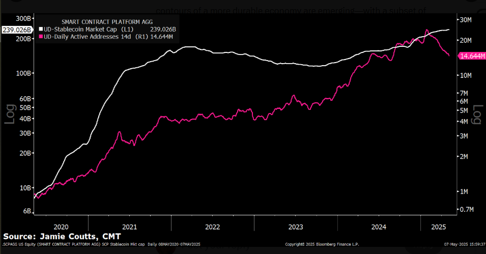 Coutts notes that this divergence will not last. More sophisticated capital will increasingly flow toward platforms that anchor real economic behavior, especially via stablecoin flows and payments.