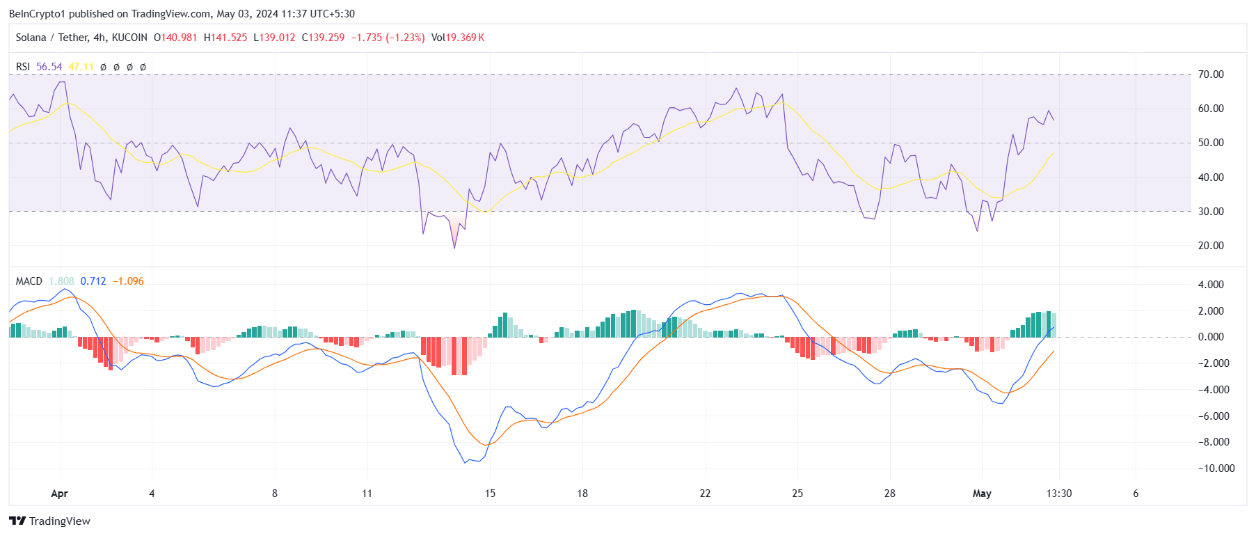 Solana’s price, currently trading at $139, forms a descending wedge that may soon break. This observation finds support in the Relative Strength Index (RSI), which gauges the speed and change of price movements.