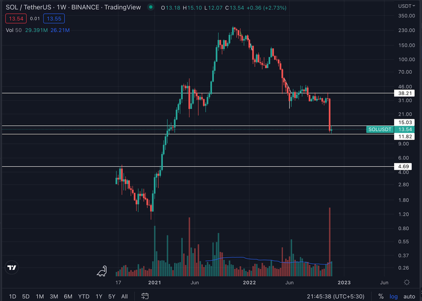 SOL has broken all the key supports. $15 was necessary to support, but the coin gave a weekly close below it. Hence the support will work as resistance now. However, in early 2021, SOL spent a few weeks from $15 to $11. It should sustain the support of $11 if there is a slight chance of recovery anytime soon. If $11 is broken, there is not much support before $4.69.