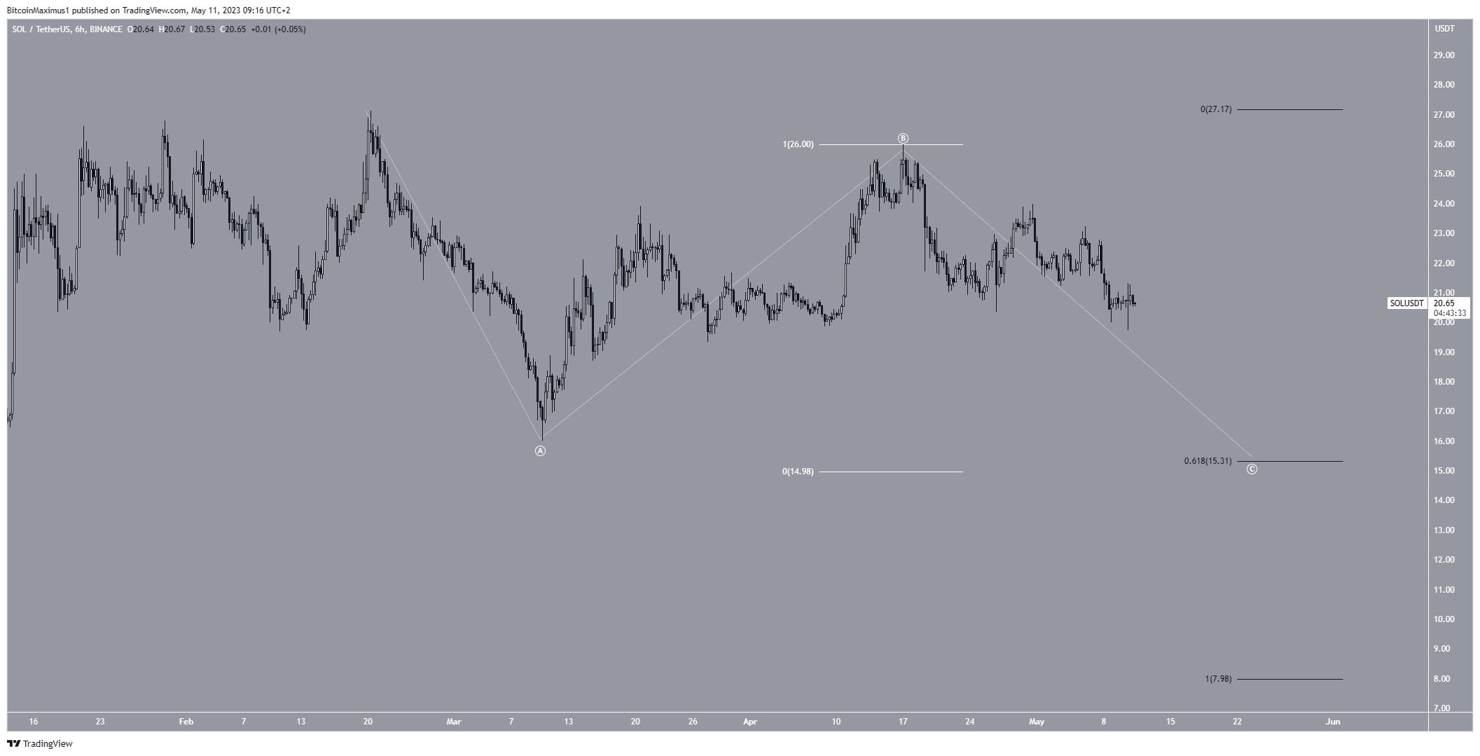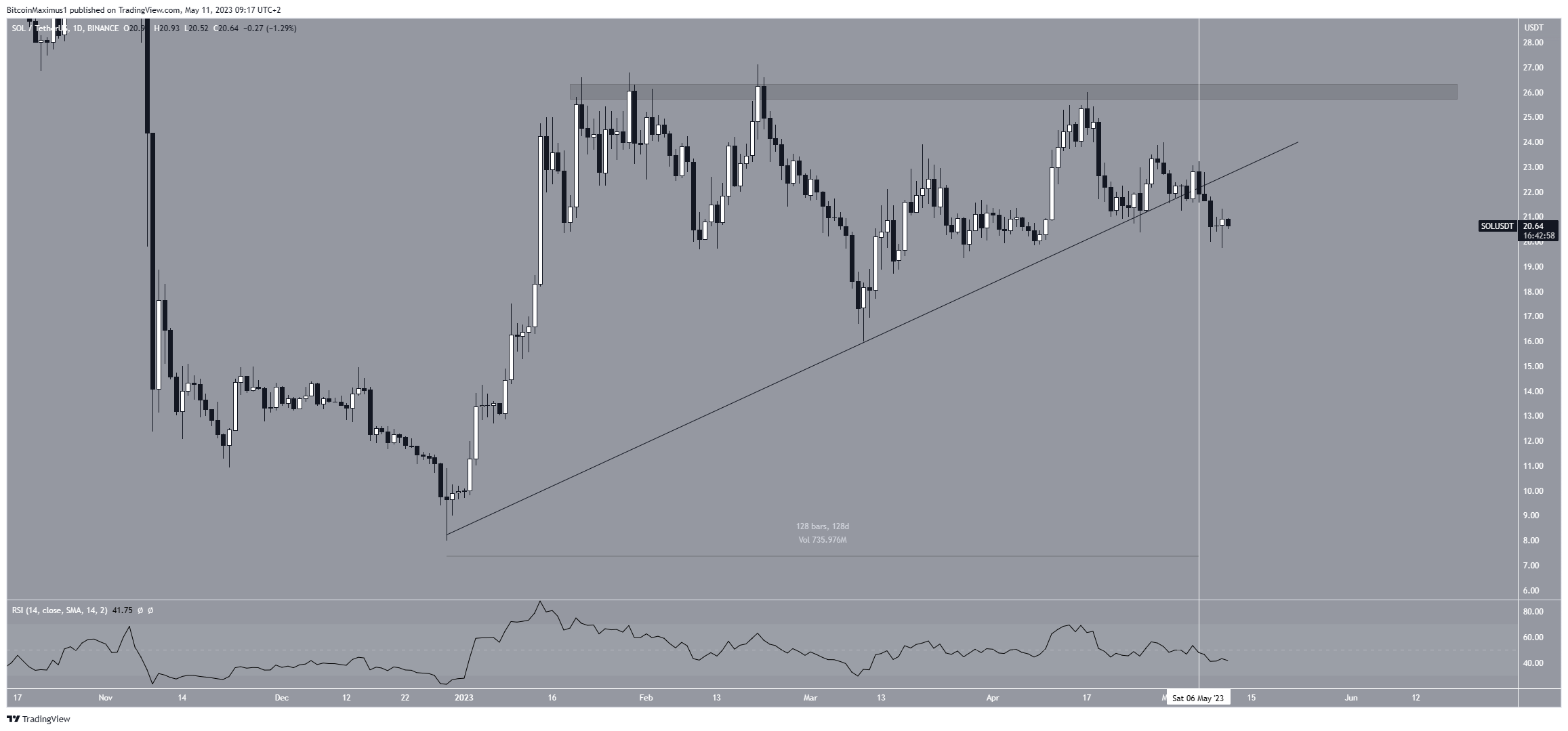 Since the beginning of 2023, the SOL price has been on the rise, following an ascending support line. It hit a yearly high of $27.12 on Feb. 20. However, the price created a lower high on April 20 and has been falling since.
