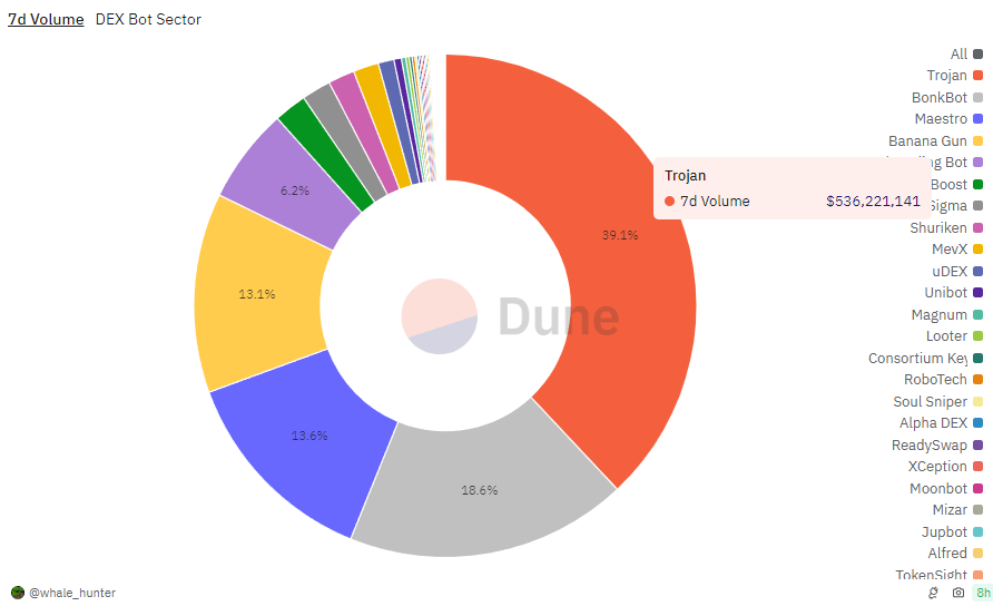 SponsoredHowever, Trojan has recently dominated the market in terms of average weekly volume. Data from Dune shows that Trojan’s weekly volume accounts for 39% of the entire DEX bot sector trading. This is followed by BonkBot, which accounts for 13.6%.