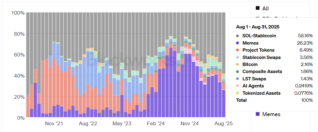 By September, meme coin activity had fallen below 30% of Solana DEX trading, its lowest share since February 2024.
