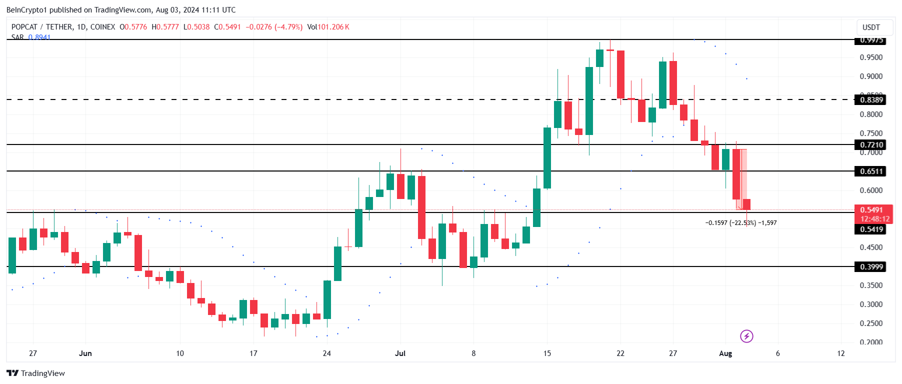 Most of the selling took place over the past day, as the meme coin fell by nearly 16% in a single day. This drop added to the drawdown from the past week, bringing the WIF price down by almost 40%.