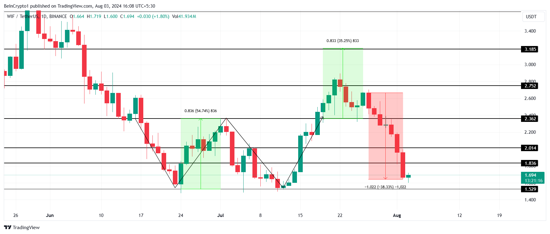 In doing so, the altcoin failed its potential 35% rally arising from the bullish double-bottom pattern. This rise would have pushed WIF price beyond $3.18. However, the pattern failed and brought the meme coin down, with WIF now trading at $1.69 at the time of writing.