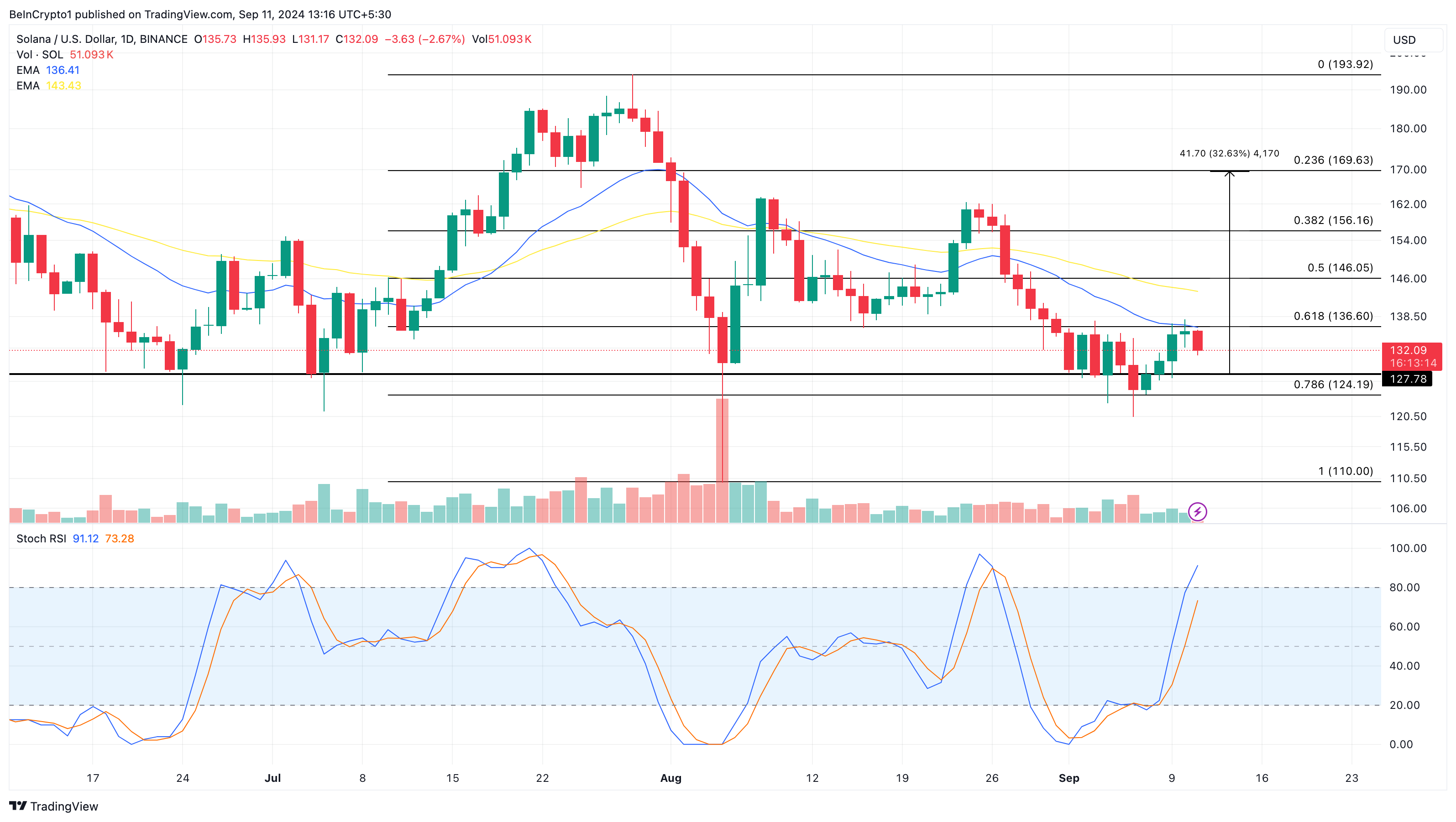 Based on current trends, Solana’s (SOL) price could dip below $130. However, the $127.78 support level suggests a potential rebound. If the token bounces from this support, it could rise above both the 20 and 50 Exponential Moving Averages (EMAs), marked in blue and yellow, respectively.