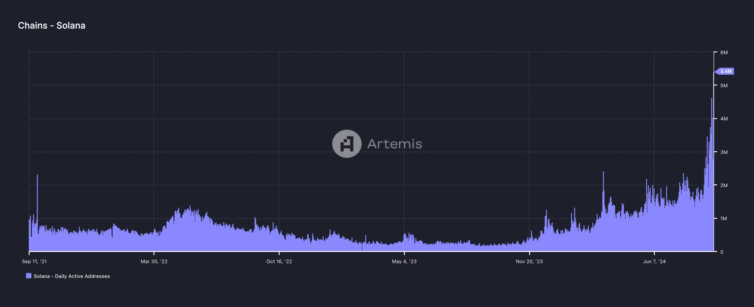 On September 10, the daily active addresses on Solana hit 5.4 million. According to an assessment of Artemis data, this was the highest level the metric has reached in the blockchain’s history.