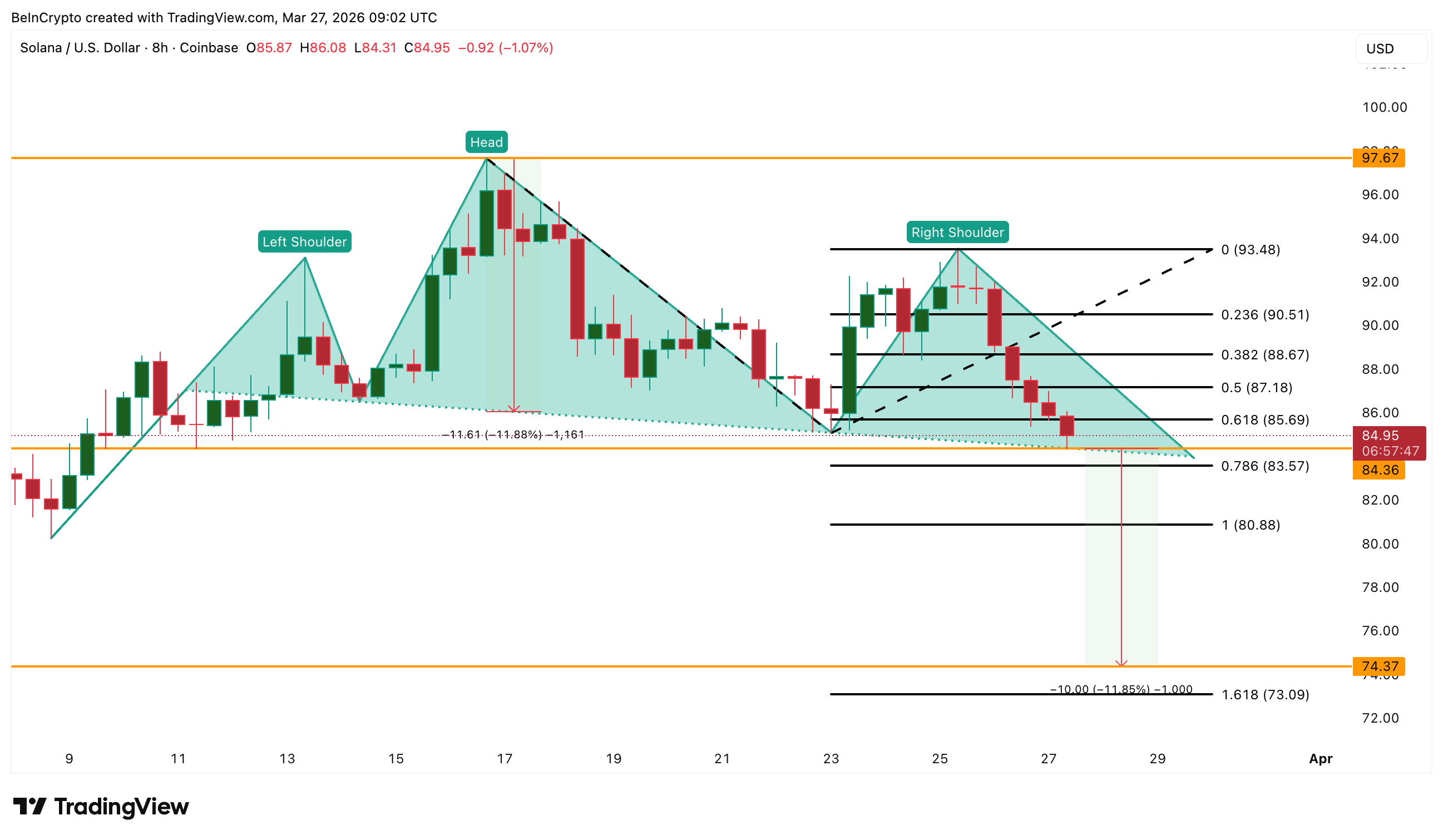 On the downside, the key trigger remains the same. If Solana loses $84.36, the neckline breaks. That can push the price toward $80.88 first, and then toward $74.37 based on the pattern projection. So the setup is clear.