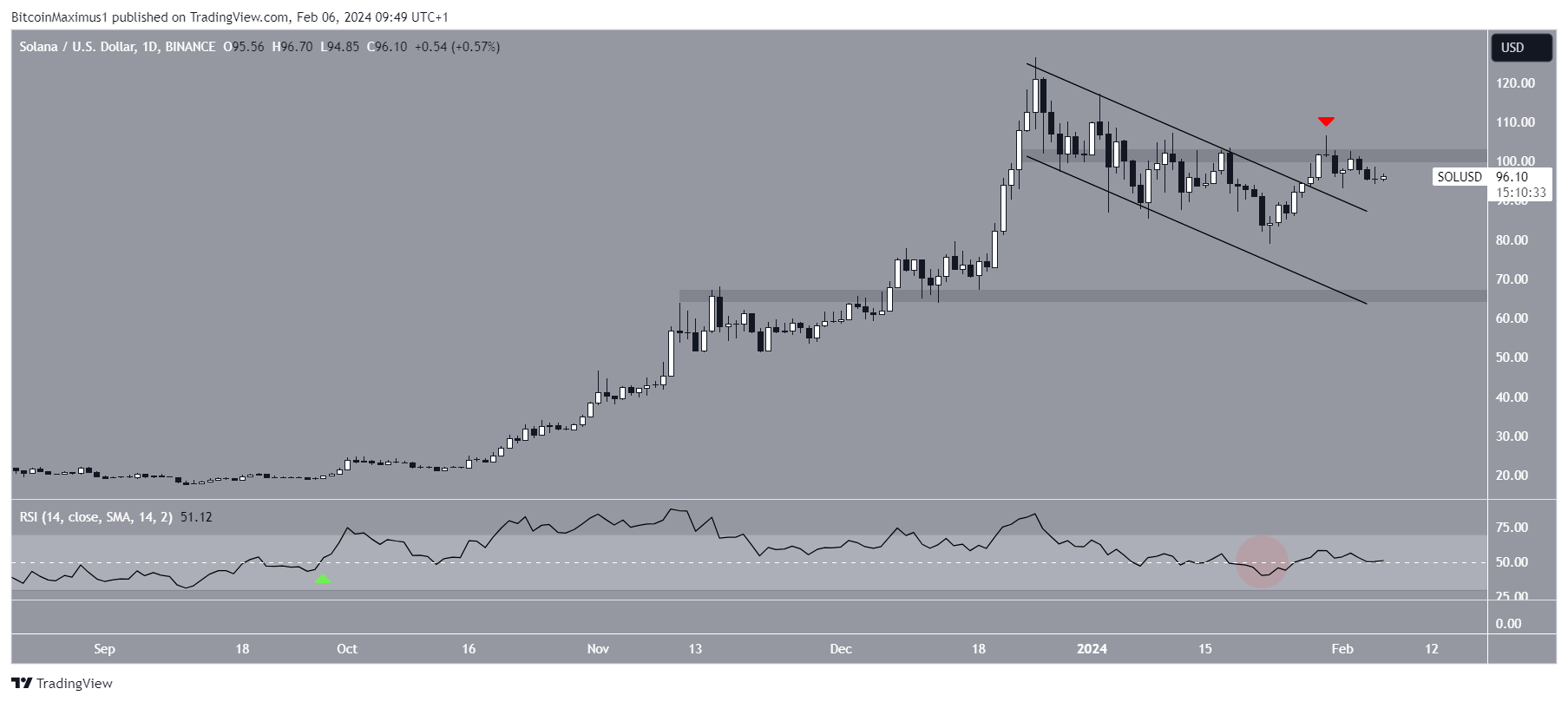The technical analysis of the daily time frame shows that SOL has fallen inside a descending parallel channel since December 25, 2023. The downward movement led to a low of $79 on January 23, 2024.